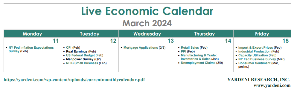 More important for the bond and stock markets will be February's CPI release (Tue). The Cleveland Fed's Inflation Nowcasting shows gains in the headline and core CPI inflation rates of 0.43% and 0.32%. The former reflects the upturn in gasoline prices (chart). Food inflation should be continuing to moderate along with agricultural commodity prices. February's import prices release (Fri) should show that China continues to export goods deflation to the US and the rest of the world.