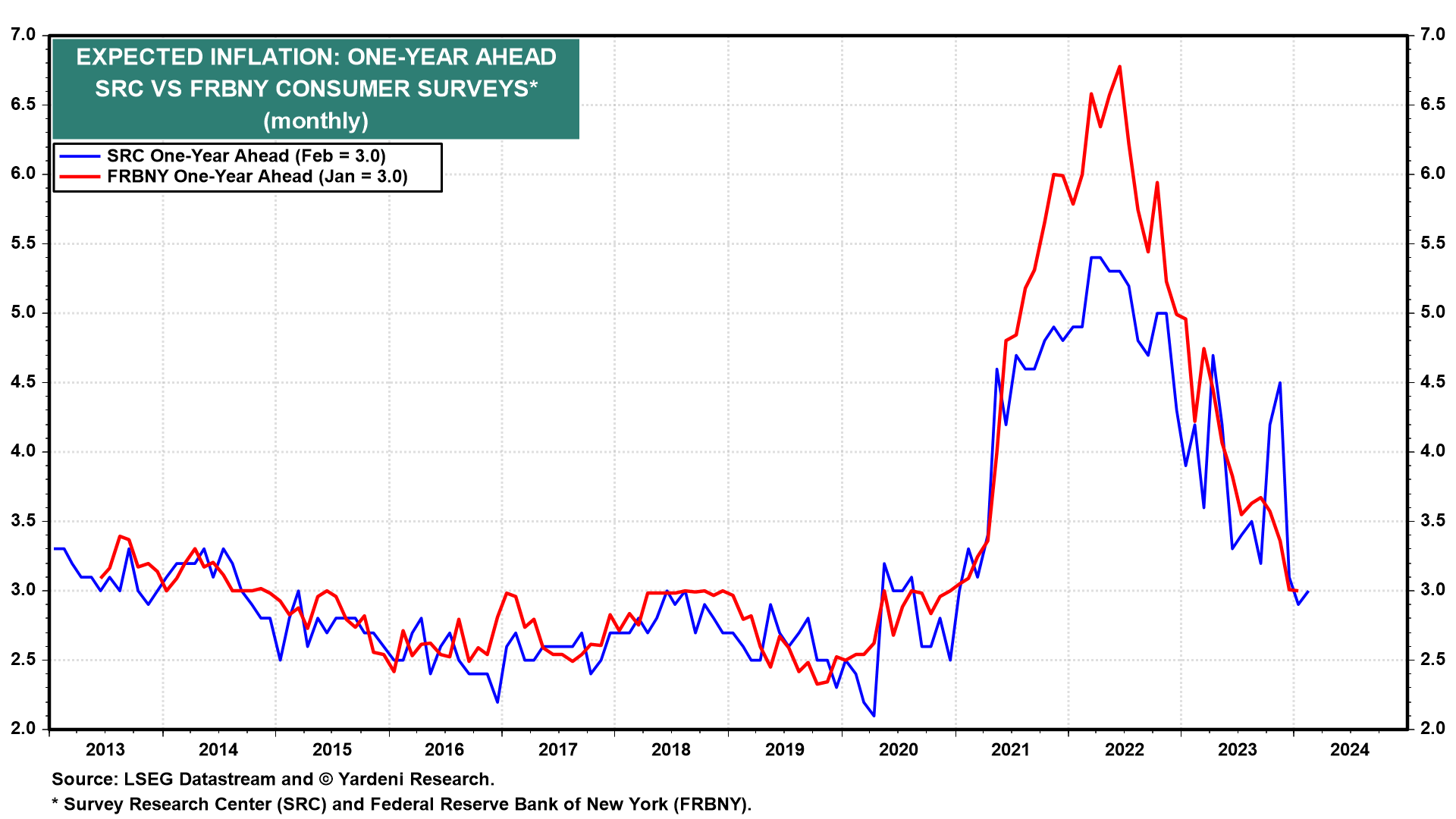 The coming week starts with a couple of key inflation indicators. Both were probably boosted by rising gasoline prices. The retail pump price is up 9.1% since the last week of January. This bounce might have boosted February's reading on the year-ahead expected inflation rate in the FRBNY consumer expectations survey (Mon). It did so, though only slightly, in a similar series from February's SCR consumer survey (chart).