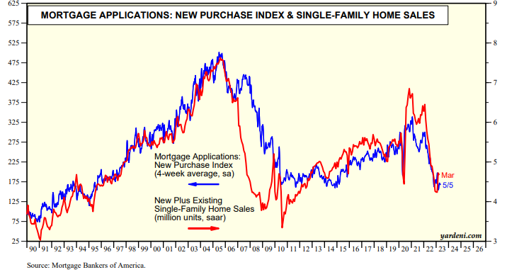 The week ahead is jampacked with coincident and leading economic indicators. The most up-to-the-minute ones will be May 12 mortgage applications (Wed) and May 13 jobless claims (Thu). The former seems to be bottoming suggesting that April housing starts (Wed) and existing home sales (Thu) might surprise to the upside, or at least not on the downside (chart)