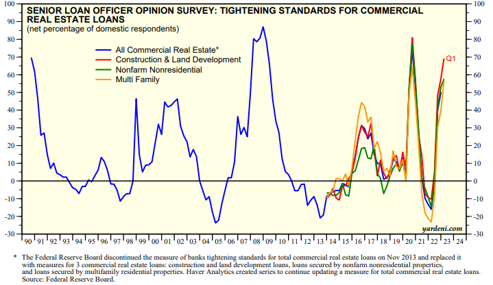Another interesting week ahead. On Monday, the Fed will release the latest Senior Loan Officers Opinion Survey (SLOOS). It is likely to show a further sharp tightening in lending standards, especially for commercial real estate loans (chart). The members of the FOMC had a copy of the SLOOS report at their meeting last week, but decided to raise the federal funds rate nonetheless. They may come to regret their last two rate hikes which occurred as the banking crisis unfolded.