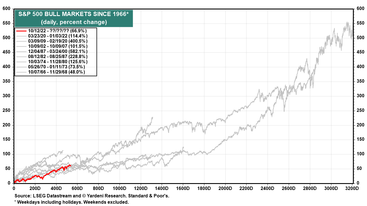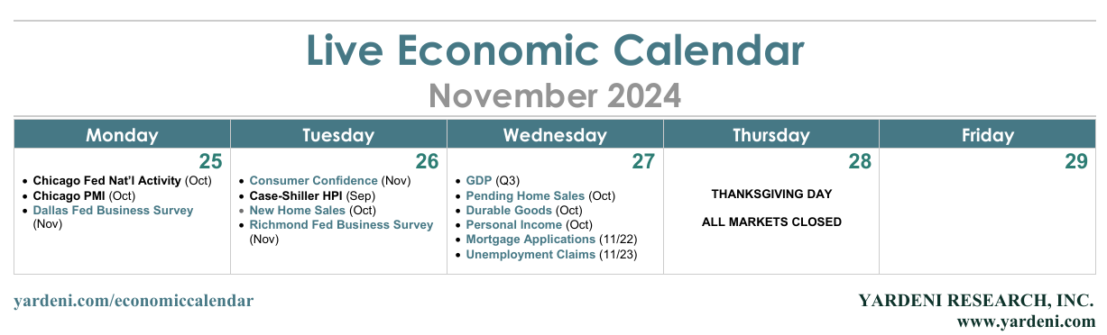 The week ahead is jampacked with economic indicator releases, all in the first three days before the Thanksgiving holiday. They are likely to confirm that we have much to be thankful for this year. The US economy and stock market are doing well. The most widely anticipated recession of all time has been a no-show for a third year. The S&P 500 is up 25.9% ytd and 66.9% since the bull market started on October 12, 2022. The current bull market may very well continue to produce strong gains as it rages on, perhaps through the end of the decade and into the 2030s. Yes, it could turn out to be one of the longer bull markets on record (chart).