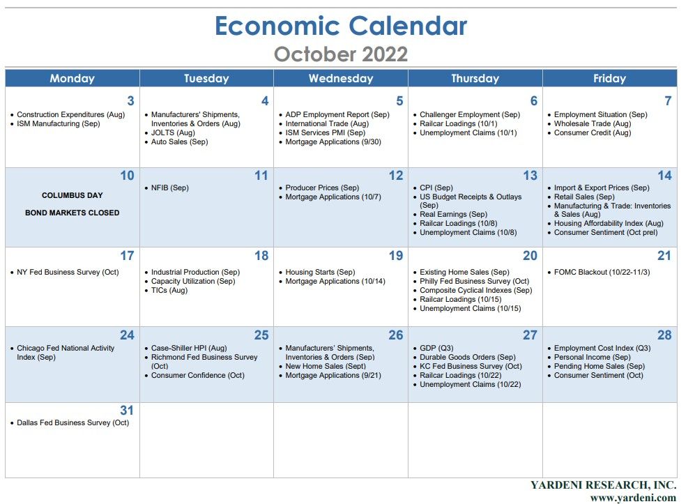 Monday is Columbus Day and the bond market will be closed. But stock investors can start the week worrying about September's PPI (Wed.) and CPI (Thu.). Both should confirm that they peaked earlier this year, but the moderation in inflation in both may not be enough to stop the Fed from concluding that more rate hikes are needed to subdue inflationary pressures. The PPI may show more moderation than the CPI, which includes a couple of rent components that remain troublesome.