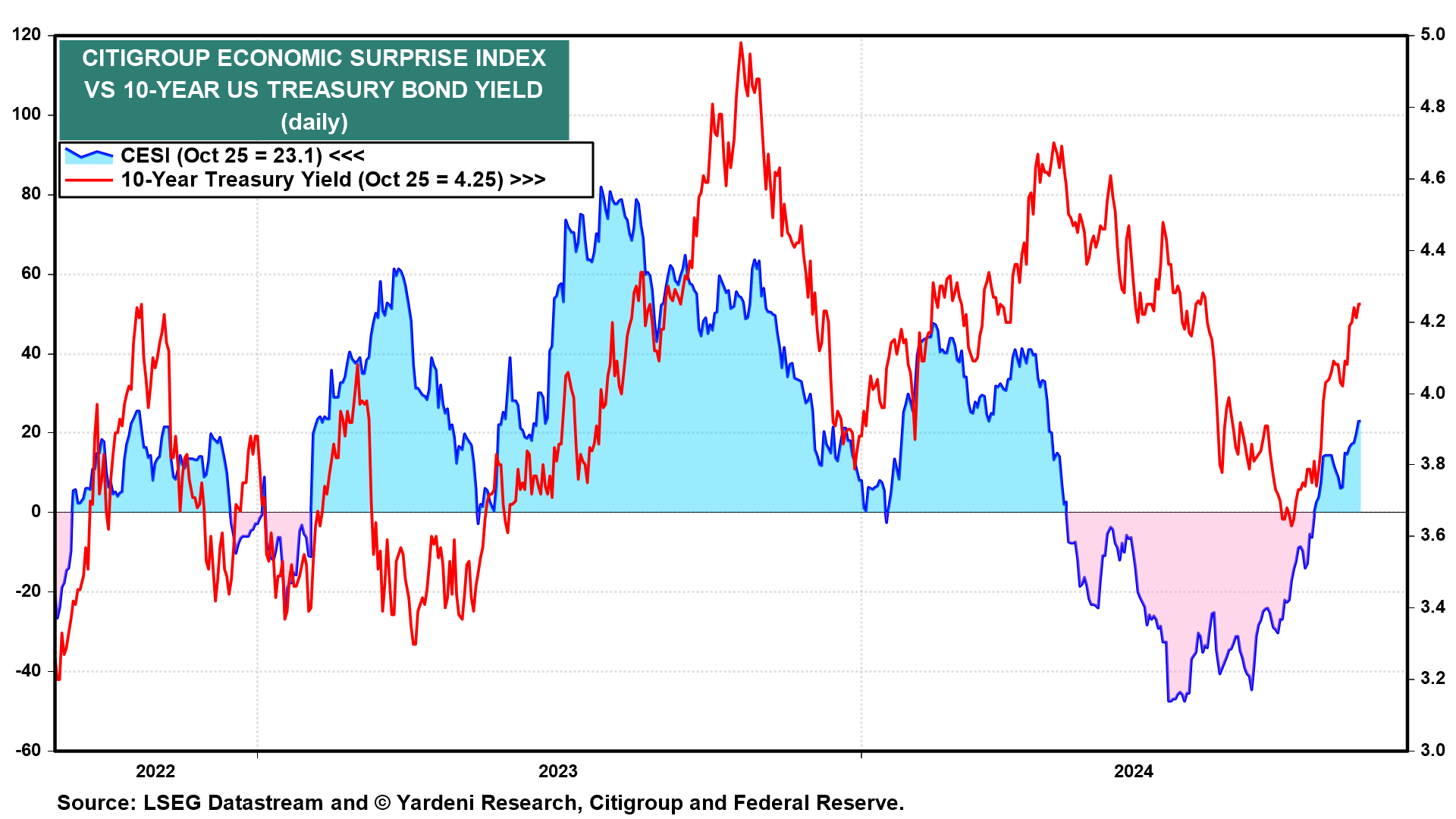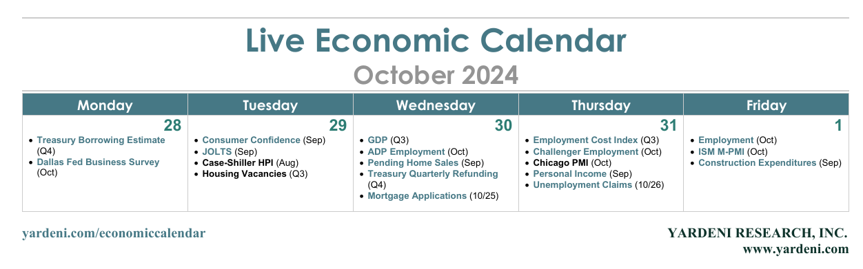 The week ahead is jampacked with key indicators for the labor market, economic growth, and inflation, as well as more Q3 S&P 500 earnings. The first estimate of Q3 GDP will be followed by the September PCED inflation rate and October payroll employment. We're expecting continued strong growth and disinflation, though we anticipate that employment was muddled by one-time factors and that some components of the Fed's preferred PCED inflation rate remained sticky. Additional strong economic data, stickier inflation, and more-than-expected Treasury financing needs could raise the 10-year Treasury yield into the 4.25% to 4.50% range (chart). That could unsettle the stock market.