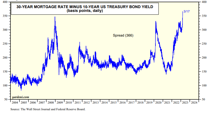 At the start of last year, "Feddie" announced plans to exist the mortgage lending business by letting its huge holdings of mortgage-backed securities roll off as they matured and possibly even sell them outright. As a result, the spread between the 30-year mortgage rate and the 10-year Treasury bond yield more than doubled from 150bps to 320bps (chart). The spread jumped to 366bps at the end of last week exceeding the peak of the Great Financial Crisis.