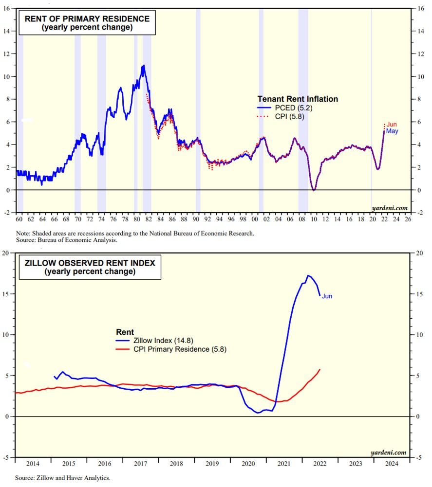 The Zillow rent survey shows that rents on new leases are up 14.8% y/y through June (chart below). The CPI rent measure reflects rents on all current leases, so it is likely to rise at a faster pace over the coming 12-18 months as the new leases with higher rents are reflected in the CPI's sample of rents.