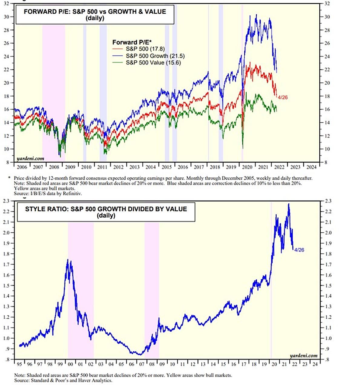 Earlier this year, the decline in these multiples reflected the jump in the 10-year US Treasury bond yield, which occurred in response to increasingly hawkish talk from Fed officials. In recent days, it seems to reflect increasing concern that the Fed will soon be too tight and cause a recession.