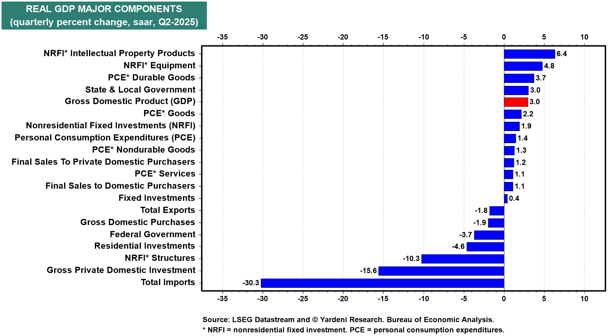 The Fed is data-dependent, and today's Q2 real GDP report justified today's FOMC decision to leave the FFR as is. The FOMC's statement and Fed Chair Jerome Powell's press conference reiterated that, aside from the two dissenters, the other Fed officials are still in no rush to lower the FFR. We thought they might signal a possible rate cut in September, but they did not do so. We are sticking with our none-and-done stance for 2025.