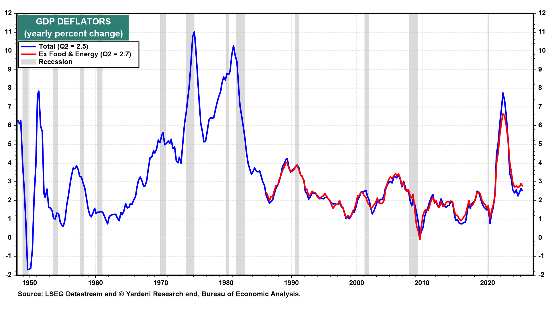 The broadest measures of price inflation in the US are the headline and core GDP deflators. They were up only 2.5% and 2.7% y/y during Q2 (chart). The Fed has achieved its dual mandate. So there shouldn't be any rush to lower the FFR. If Trump got his rate cuts now, the result would likely be higher bond yields and mortgage rates and a stock market meltup that would set the stage for a meltdown. Message to the President: Beware of what you wish for.