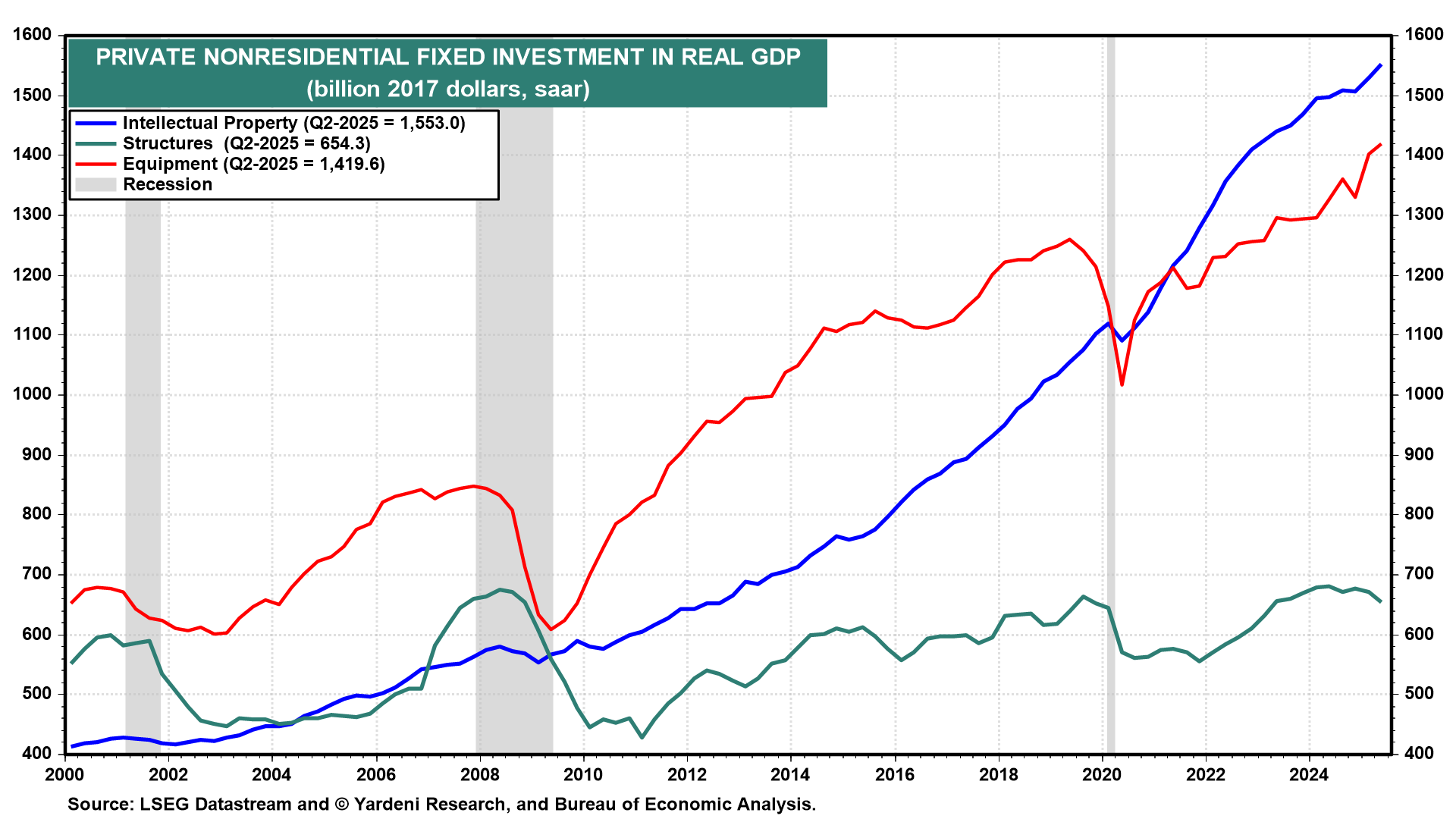 Among the strongest components of real GDP were capital spending on information processing hardware (included in business equipment) and software (included in intellectual property) (chart). The epicenter of the Digital Revolution is datacenters, which are where the Cloud resides. AI is creating lots more data to store and process in the Cloud. The sky is the limit.
