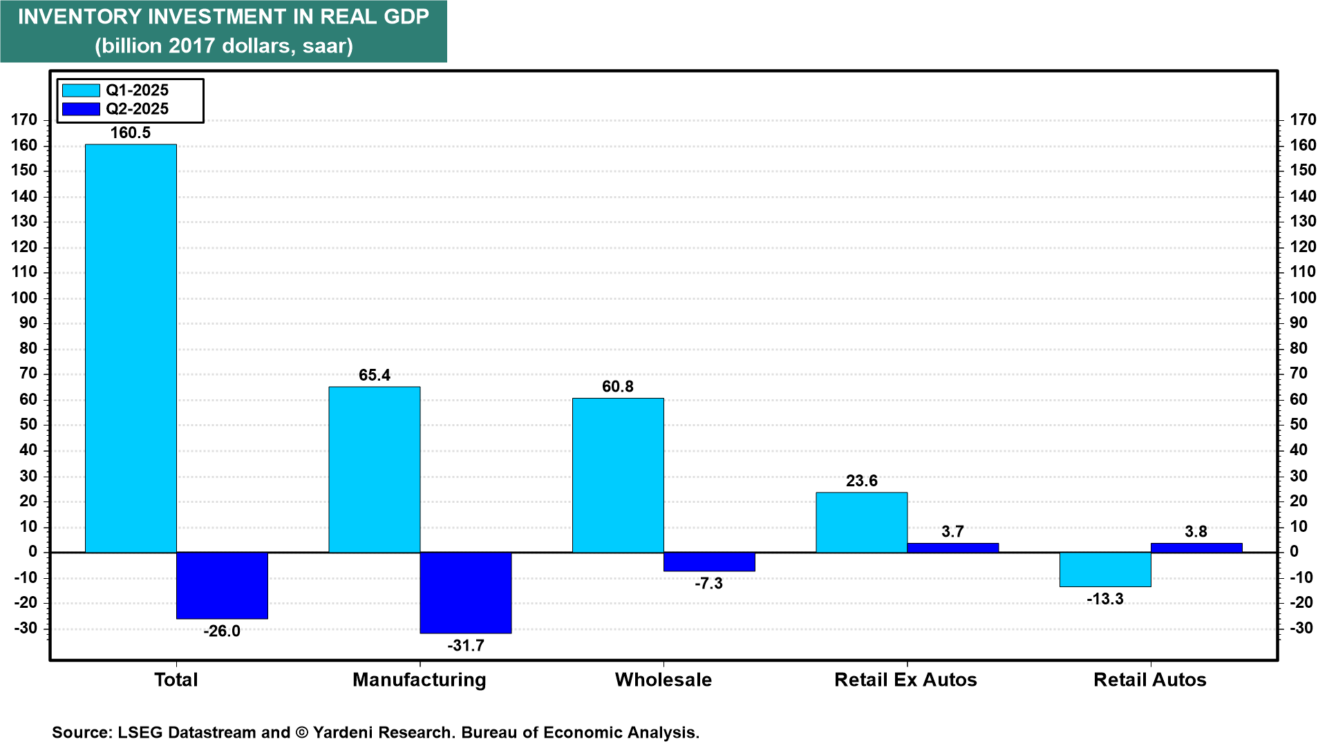 Weighing on real GDP was a big drop in inventory investment during Q2 compared to Q1 (chart). Inventory investment should be a positive contributor to Q3's growth rate.