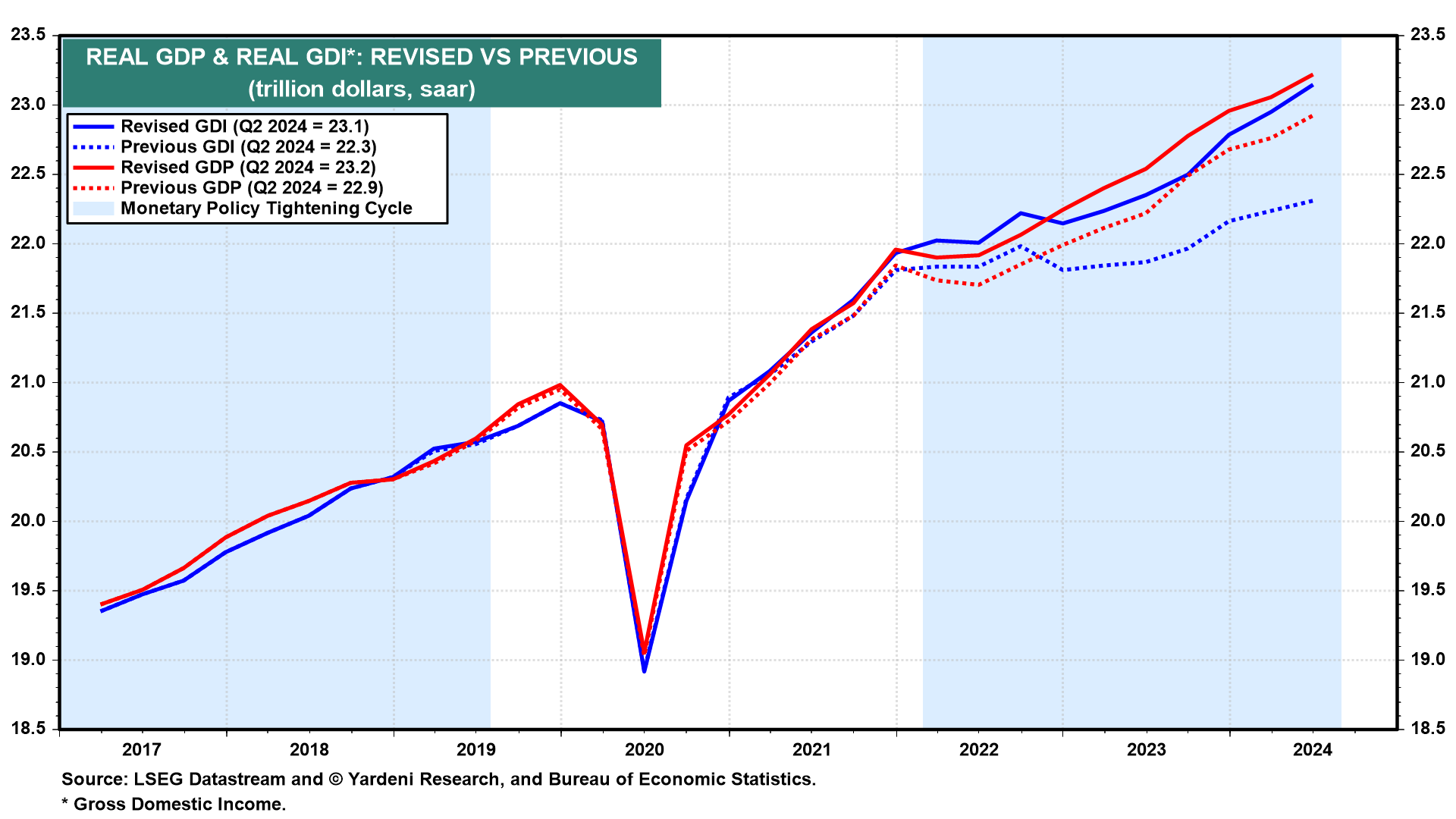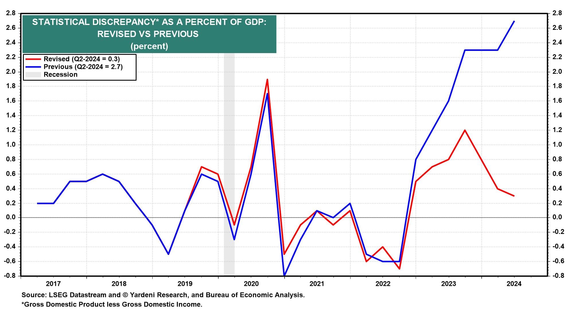 The statistical discrepancy between nominal GDP and GDI was revised down to just 0.3% from an unusually wide 2.7% during Q2-2024 (chart). Several economists warned that GDP was likely to be revised down to reduce the discrepancy. They were wrong. GDI was revised up along with personal income.
