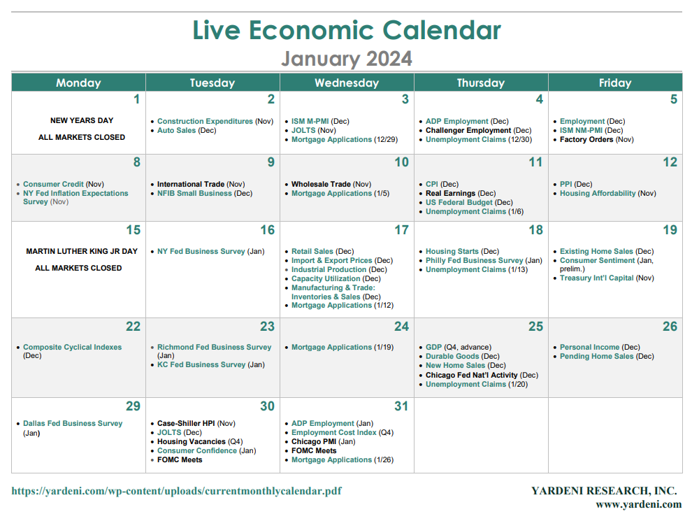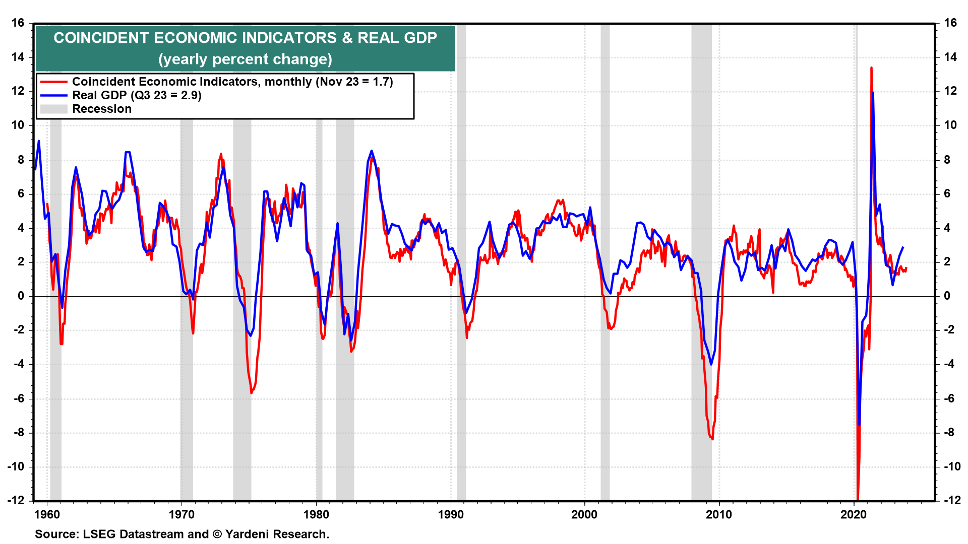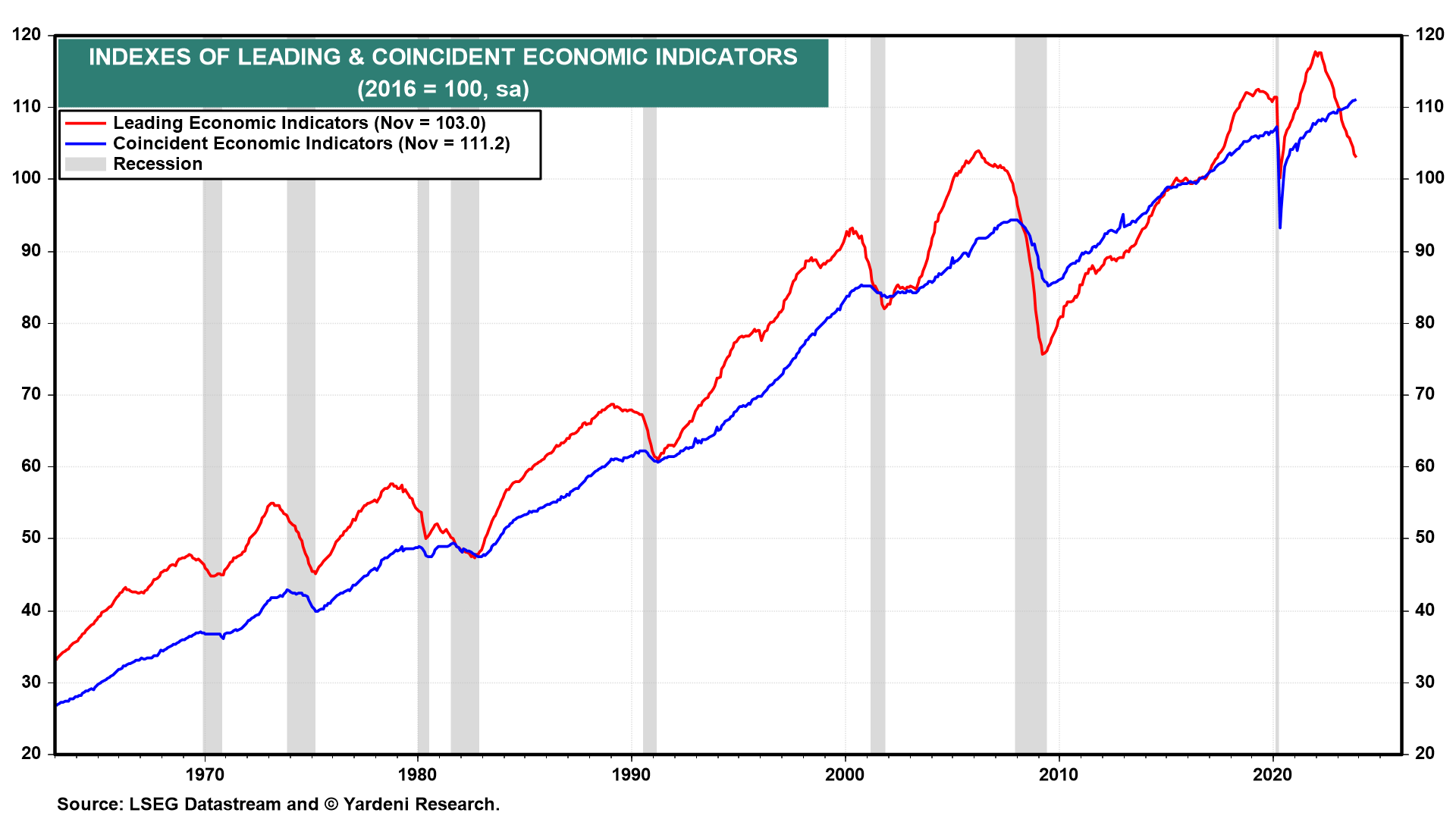 The week ahead should be another good one for our "immaculate disinflation" scenario. December's Index of Coincident Economic Indicators (Mon) probably rose to another record high (chart). Payroll employment rose to a new high last month. Real personal income and real business sales of goods probably did the same. Production upticked in December. The Index of Leading Economic indicators has been misleadingly pessimistic since December 2022. December's LEI might show a small uptick (for a change).