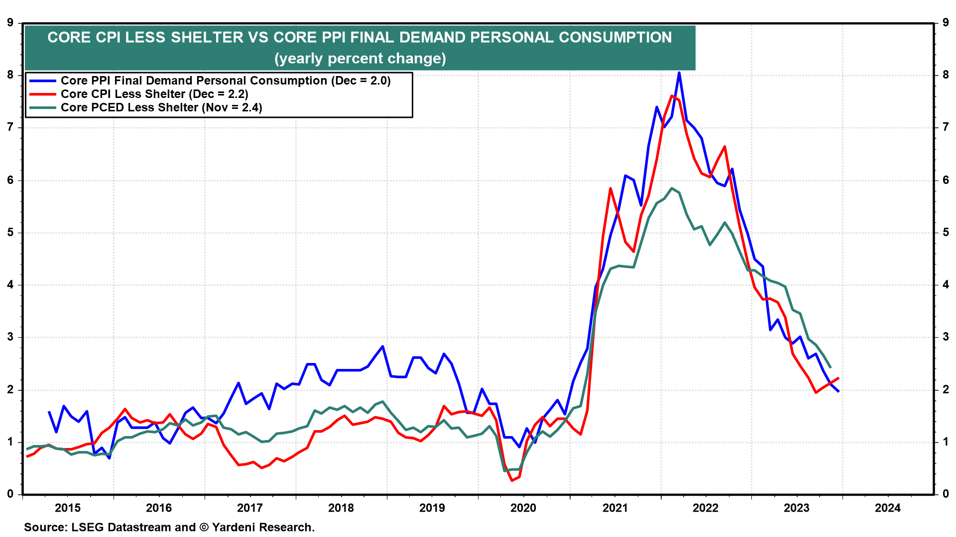 December's personal income report (Fri) should show that consumers are still doing what they do best and that the PCED inflation rate continues to moderate. The core PCED less shelter measure of consumer prices rose 2.4% y/y during November. December's comparable readings for the CPI and PPI were lower at 2.2% and 2.0% (chart). Shelter has been slower to disinflate, but it has a smaller weight in the PCED than in the CPI.