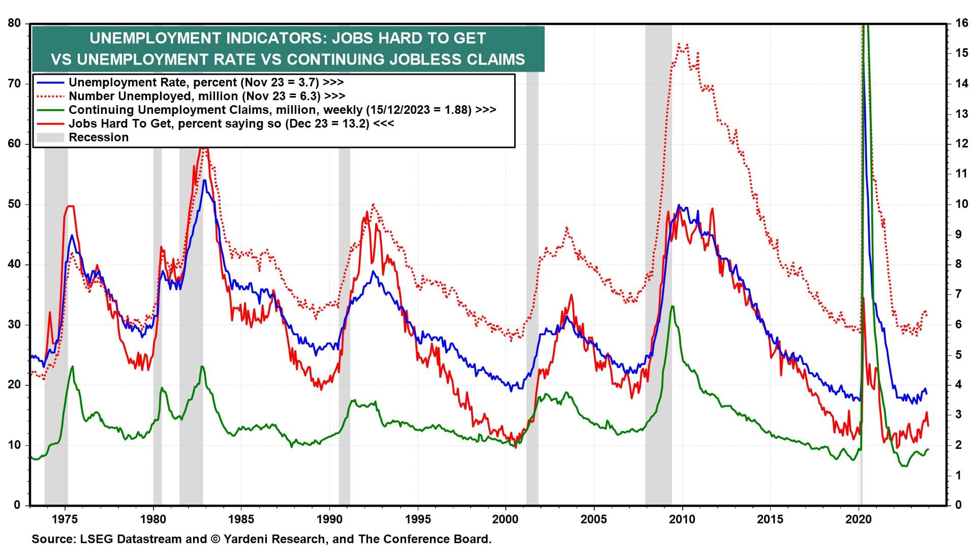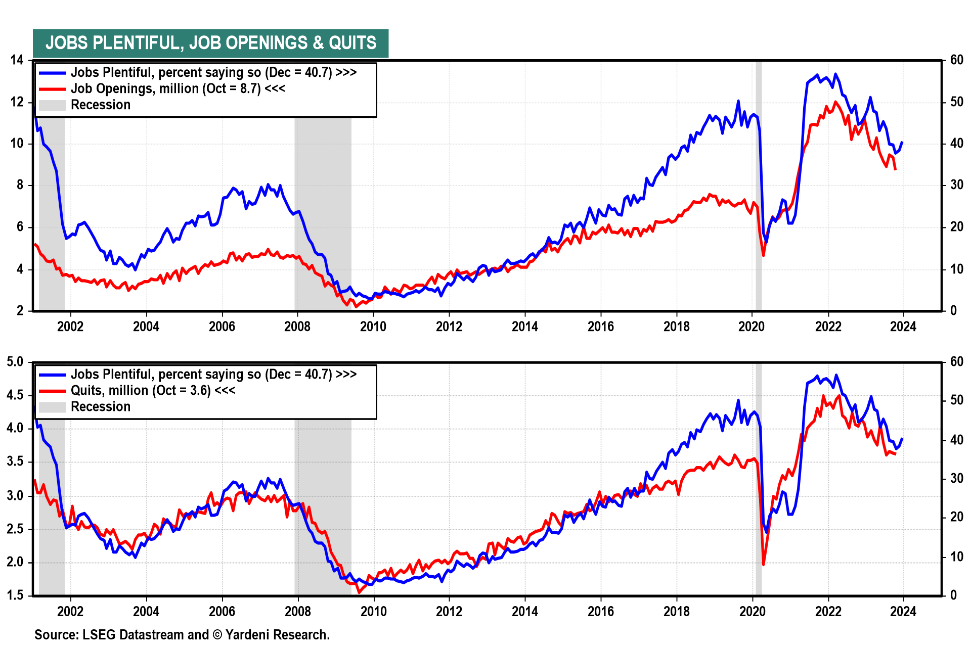(1) November's JOLTS report (Tue) should confirm that there are still more job openings than unemployed workers. We know that from December's upbeat "jobs plentiful" data included in the consumer confident survey (chart).