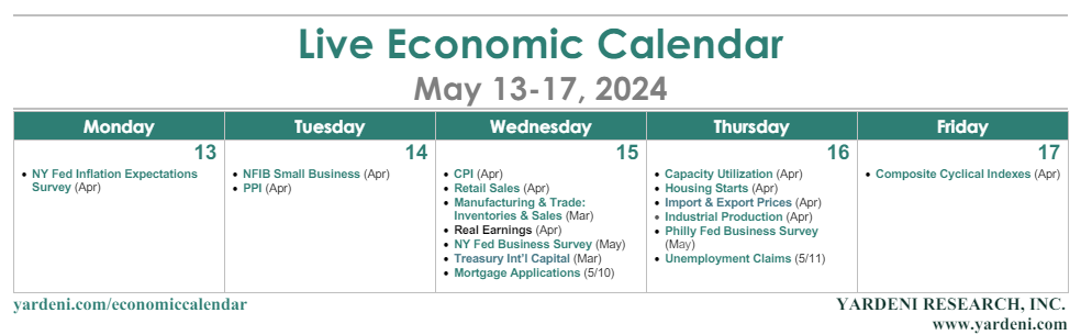 The week ahead is jampacked with economic indicator releases. The big ones are for inflation, retail sales, and production. They may be somewhat stagflationary on balance, showing inflation remains too high while economic growth is slowing. Nevertheless, we still expect to see inflation moderate with solid economic growth over the rest of this year. Here are a few observations on this week's key indicators:
