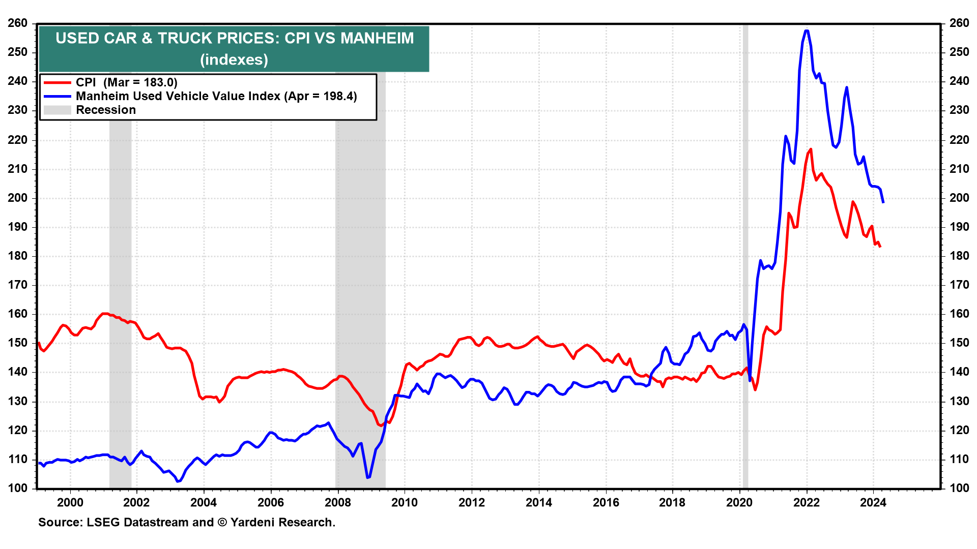 On the other hand, falling used car prices weighed on the core CPI last month (chart). However, more expensive auto maintenance & repairs and auto insurance might continue to boost inflation. Rent inflation should continue to show a moderating trend.