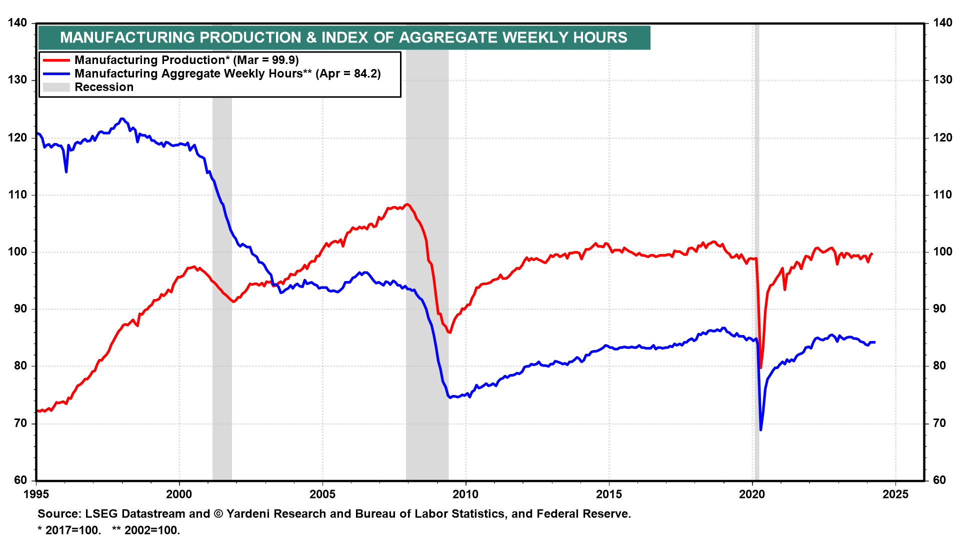 (3) Industrial production. Manufacturing aggregate weekly hours were flat in April, which we expect to weigh on the industrial production report (Thurs) (chart). Corroborating that story is April’s M-PMI, which fell below 50.0, though its production index was at 51.3.