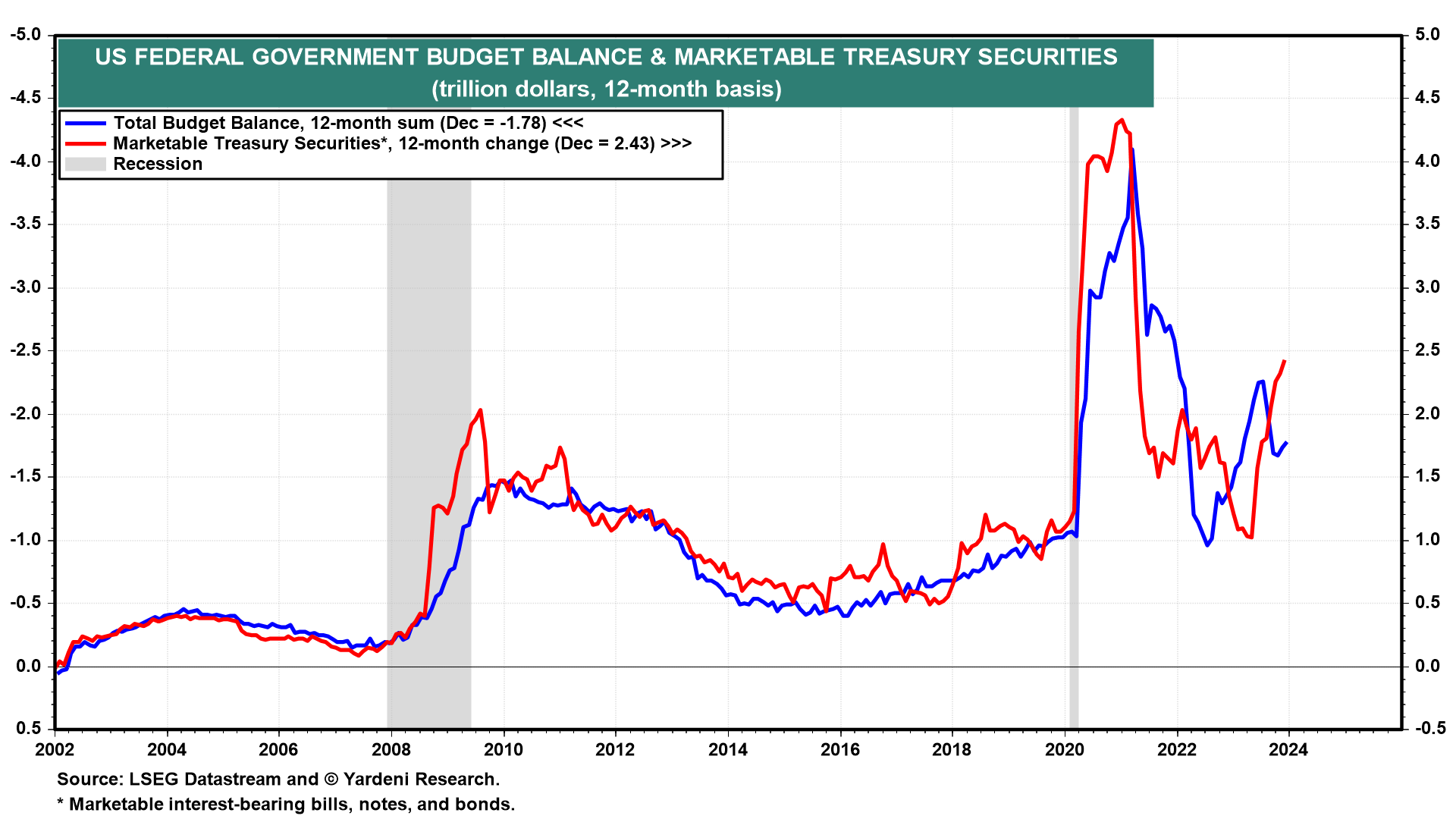 (2) Budget deficit. The Treasury’s auction of 10-year bonds Wednesday was slightly weak at a yield of 4.028%. This afternoon, the US Treasury released December's deficit and debt data showing the former at $1.78 trillion over the past 12 months while the latter rose $2.43 trillion over the past 12 months (chart).