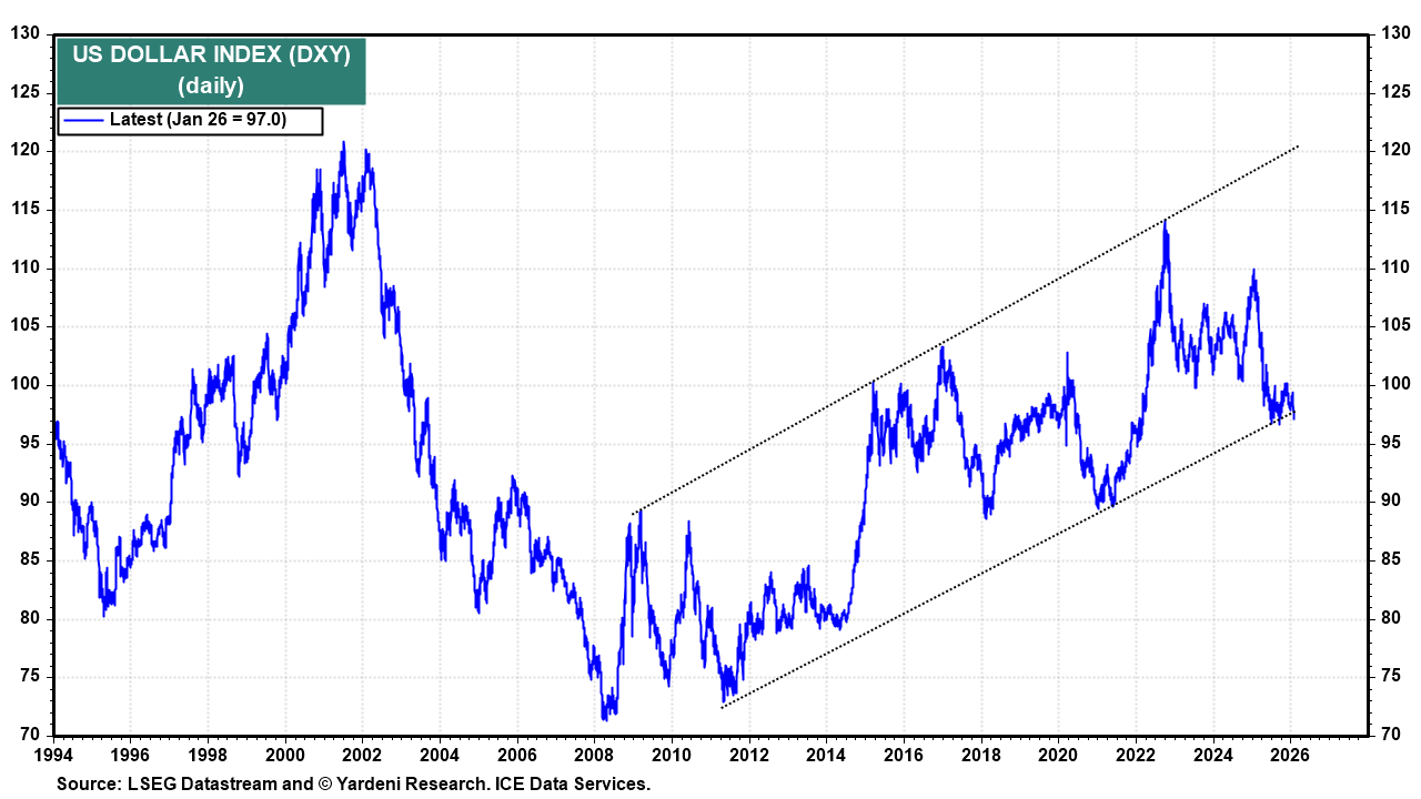 The consensus view was that global investors were selling their US stocks and bonds to buy more of such securities in Europe, Japan, and emerging markets. Soaring precious metals prices last year and so far this year are giving the Sell America trade even more credibility, as is the weak dollar, which seemed to be finding support above its rising uptrend line. It edged below it today as the yen bounced from its recent fall (chart).