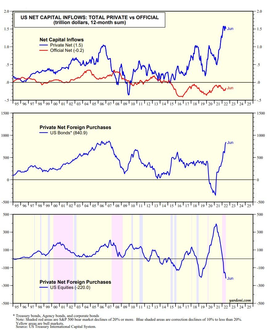(2) On a 12-month basis through June, private net foreign purchases of US bonds was a near record $840.9 billion (chart below). That certainly helps to explain why bond yields have remained so low this year despite the Fed's rate hikes and persistently high inflation.
