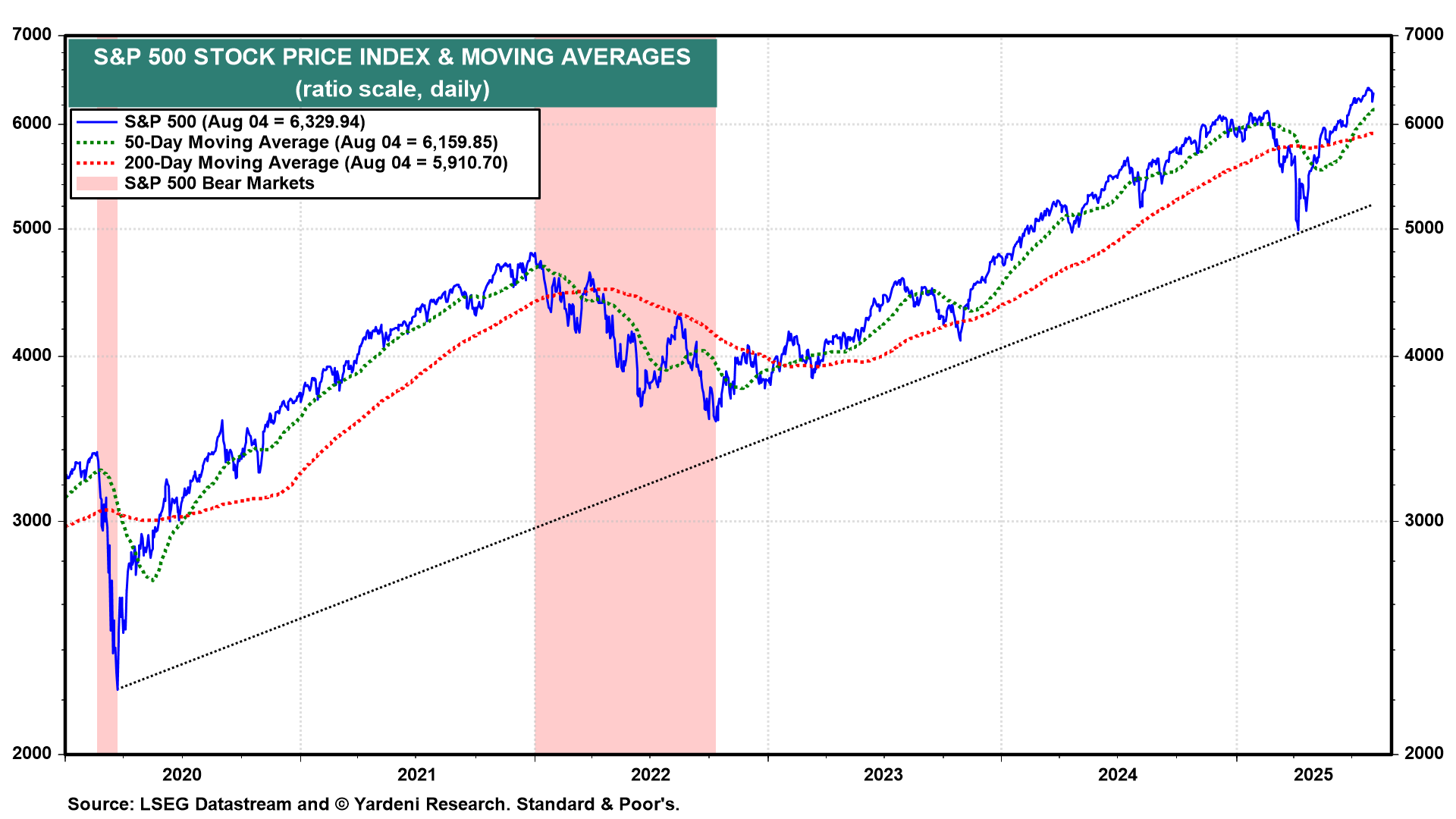 The V-shaped rebound in stock prices that started on April 9 drove the S&P 500 to a record high of 6389.77 on July 28 (chart). It dropped sharply on Friday and bounced back up to 6329.94 today.