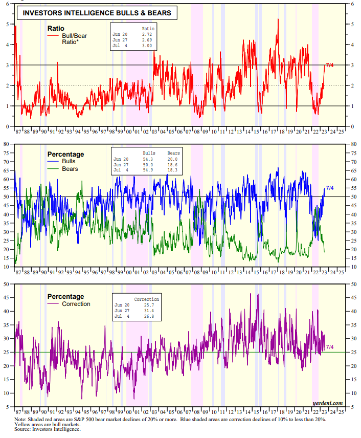Are there too many bulls? The Bull/Bear Ratio (BBR) compiled by Investors Intelligence jumped to 3.00 during the July 4 week, up from 2.69 the previous week (chart). It is the highest reading since the bull run from March 23, 2020 through January 3, 2022. The bull then got gored during the bear market through October 12, 2022. During the latest week, the bullish percentage rose to 54.9%, while the bearish percentage fell to 18.3%.