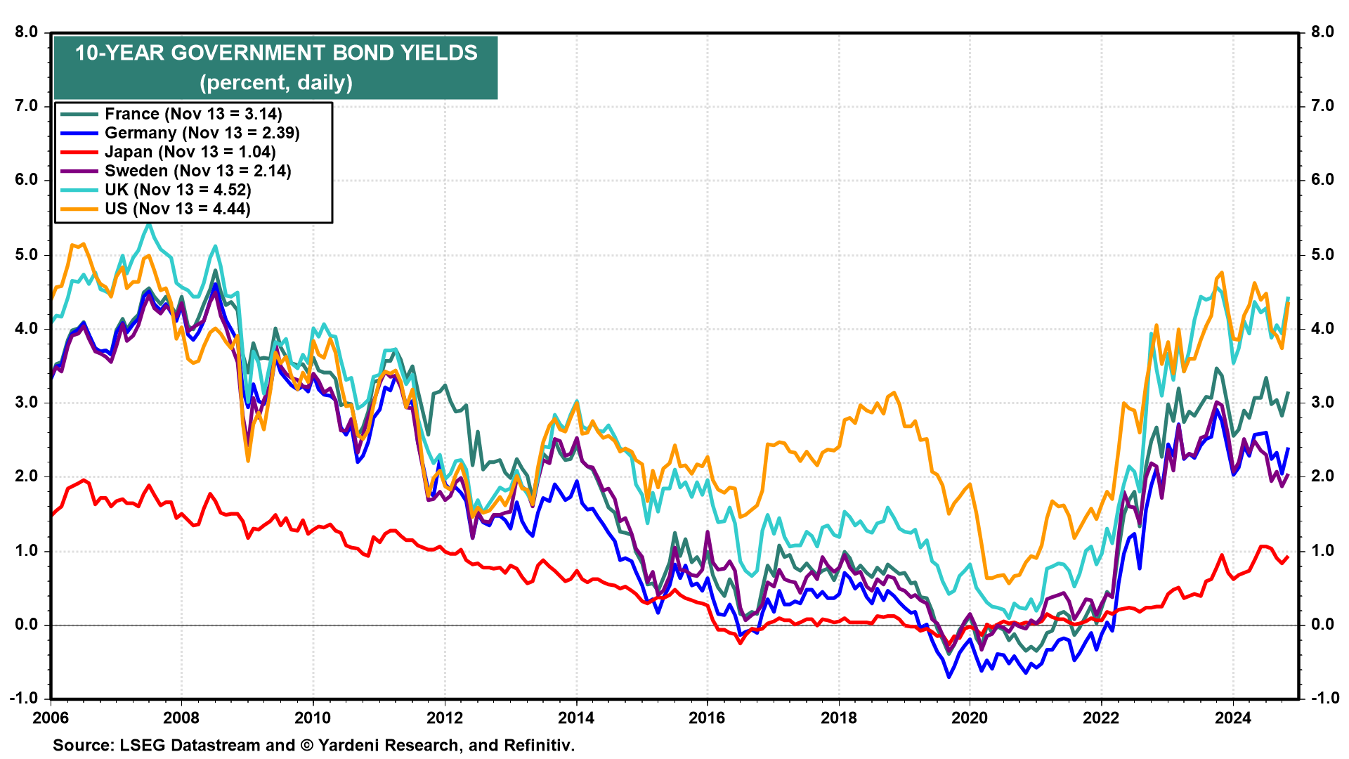 We've been bullish on the dollar for a while. Since, the Fed's September 18 meeting, the US Dollar Index (DXY) is up 5.8% (chart). Roughly half of that move has occurred since last Tuesday's US elections. The strong dollar confirms our view that the Fed has already cut the federal funds rate too much too soon, and now likely won’t be lowering rates as much as previously expected going forward. The bond market agrees, as we have noted before.