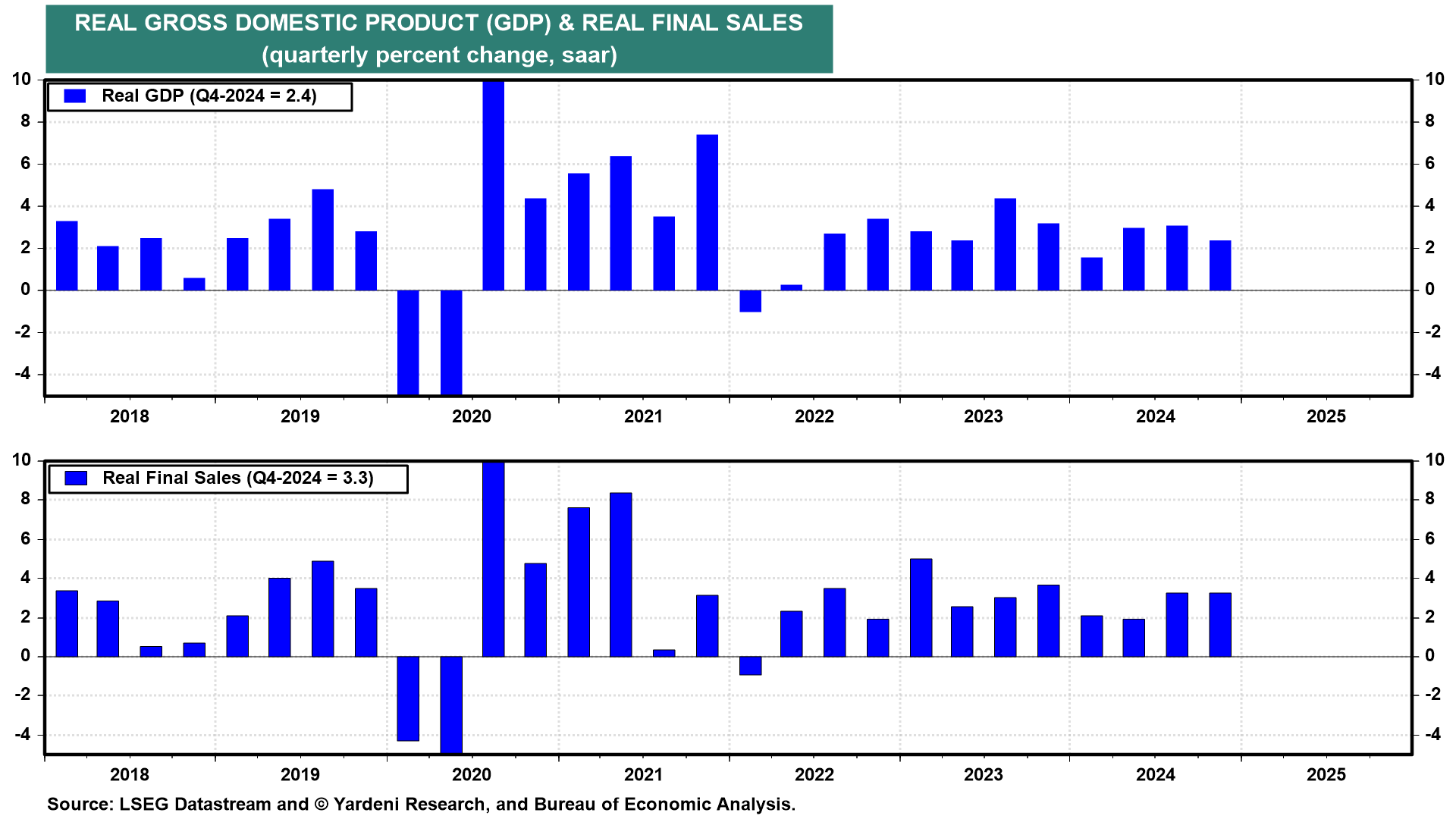 (1) Q4 real GDP was revised 0.1% higher to 2.4% (saar) (chart). Real final sales was strong at 3.3%, and real Gross Domestic Income (GDI) was 4.5%, putting the average of GDP and GDI at a very strong 3.5%.