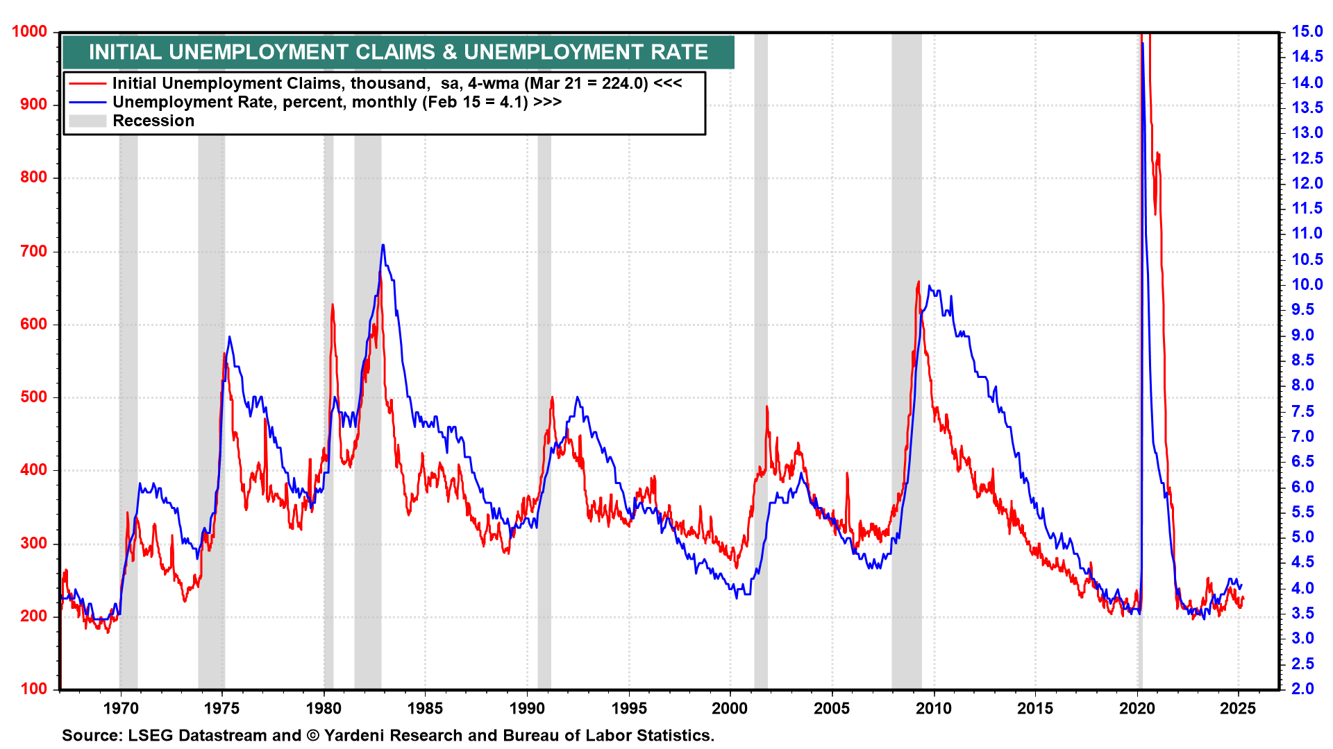 (2) Unemployment. Initial unemployment claims continue to indicate that layoffs and the unemployment rate remain low (chart). Initial claims increased 1,000 to 224,000 last week, while continuing claims fell 36,000 to 1.856 million.
