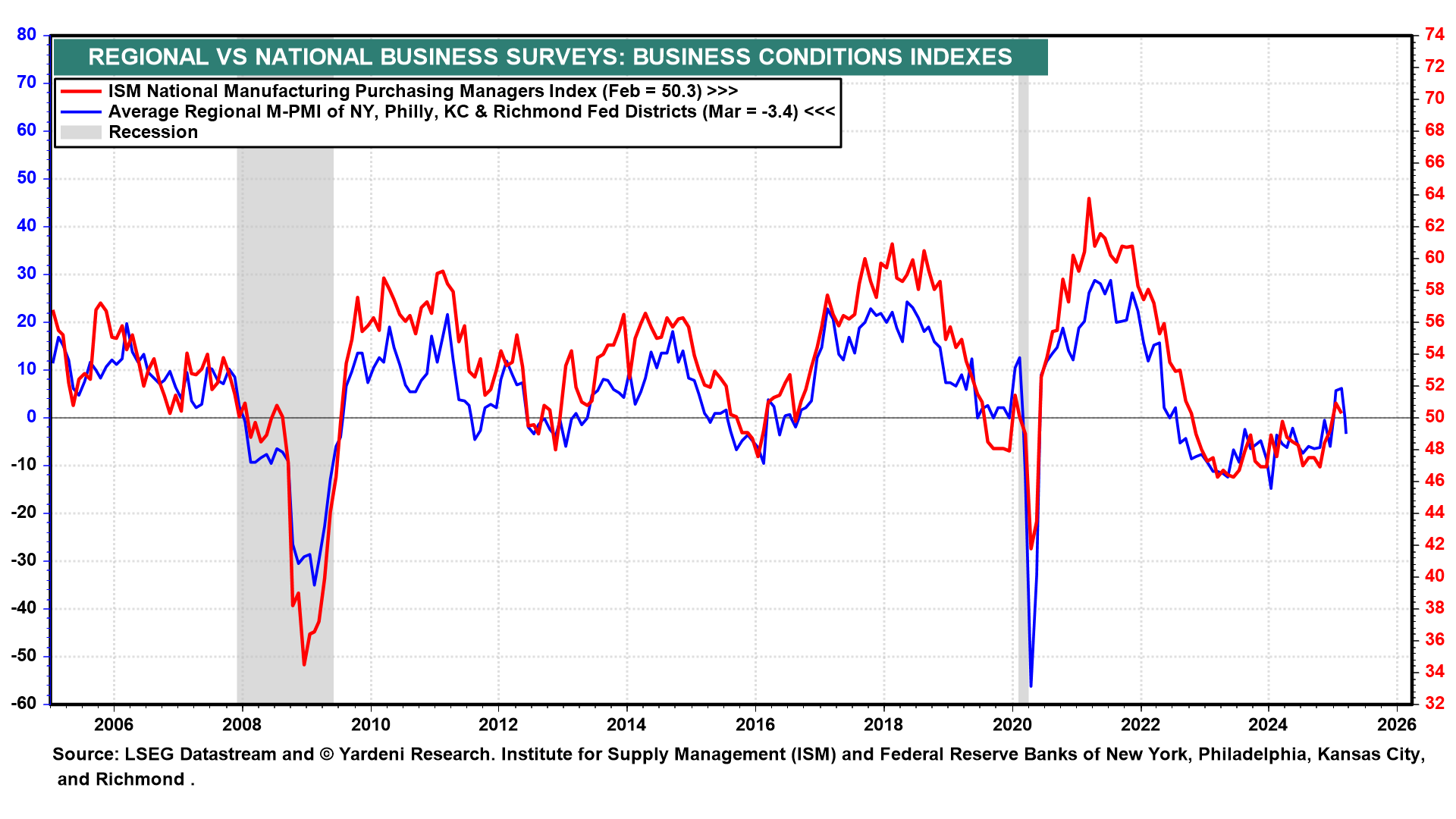 (3) Manufacturing. March's regional M-PMI from the Kansas City Fed suggested tariff turmoil is depressing the manufacturing sector in the district. Growth expectations are down, and prices paid are rising. The rolling recovery in manufacturing is on hold, and the national ISM M-PMI may sink back below 50.0 in March after two months in expansion territory (chart).