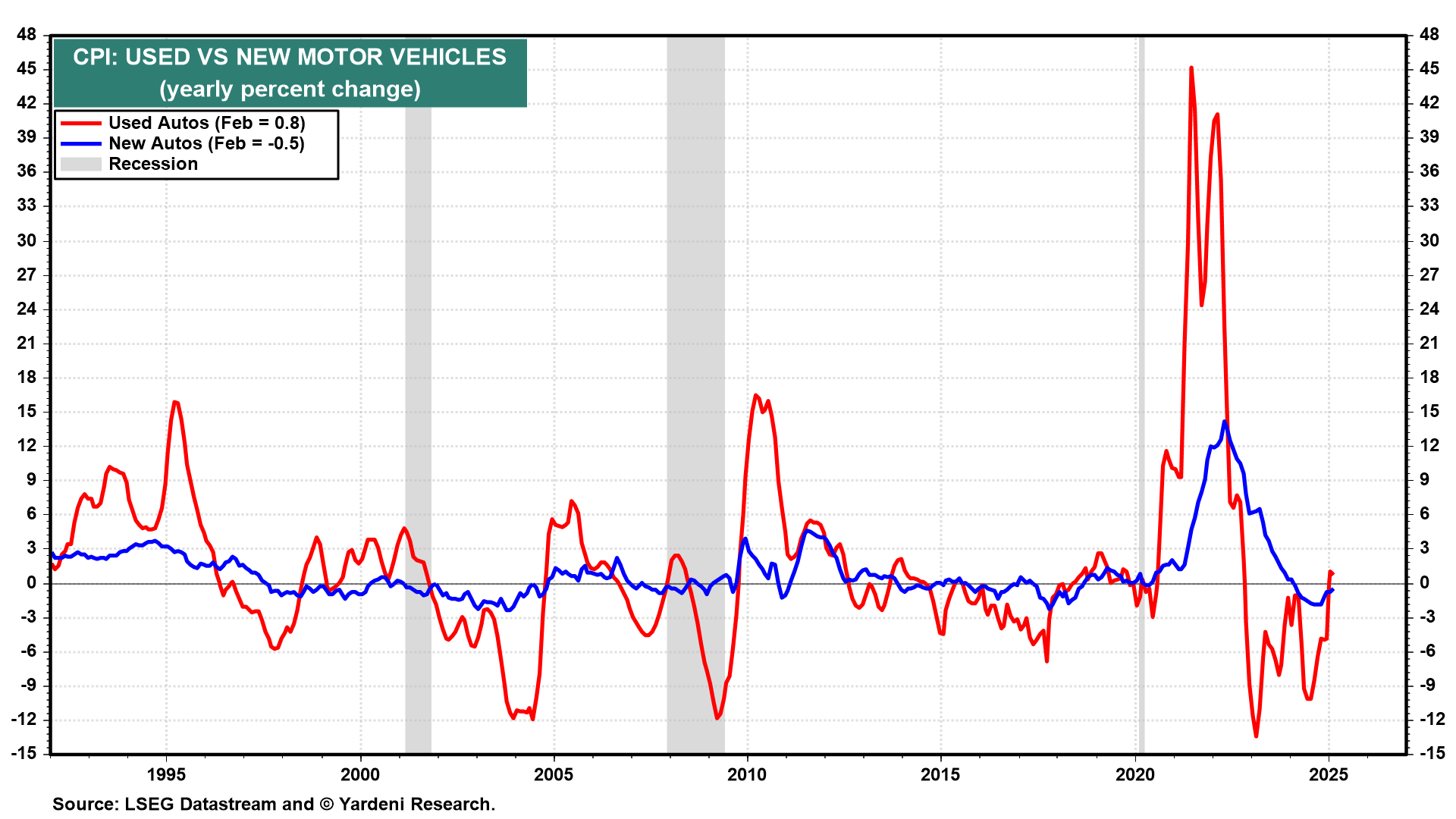 At the moment, the 25% tariff is expected to be on top of those coming on April 2. That would put cumulative tariff rates as high as 50% for imported autos. Demand for used cars is likely to surge as tariffs make new cars less affordable, which will likely boost consumer inflation (chart). Higher auto prices would depress consumer spending on autos.