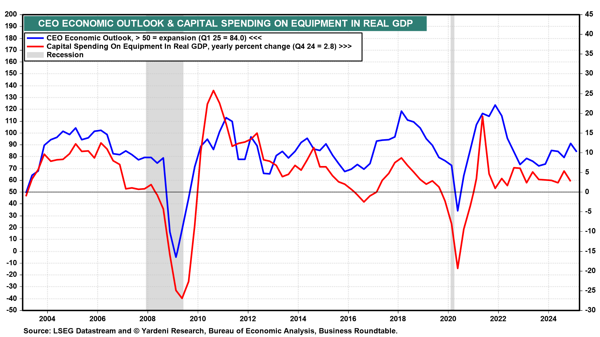 This quarter’s survey, conducted from February 19 through March 7, 2025, was completed by 150 CEOs. More than three-quarters of responses were submitted before the 25% US tariffs on Canada and Mexico were announced on March 3, 2025. Odds are that the Q2 survey will show a big drop in the CEO index, which could weigh on capital spending.