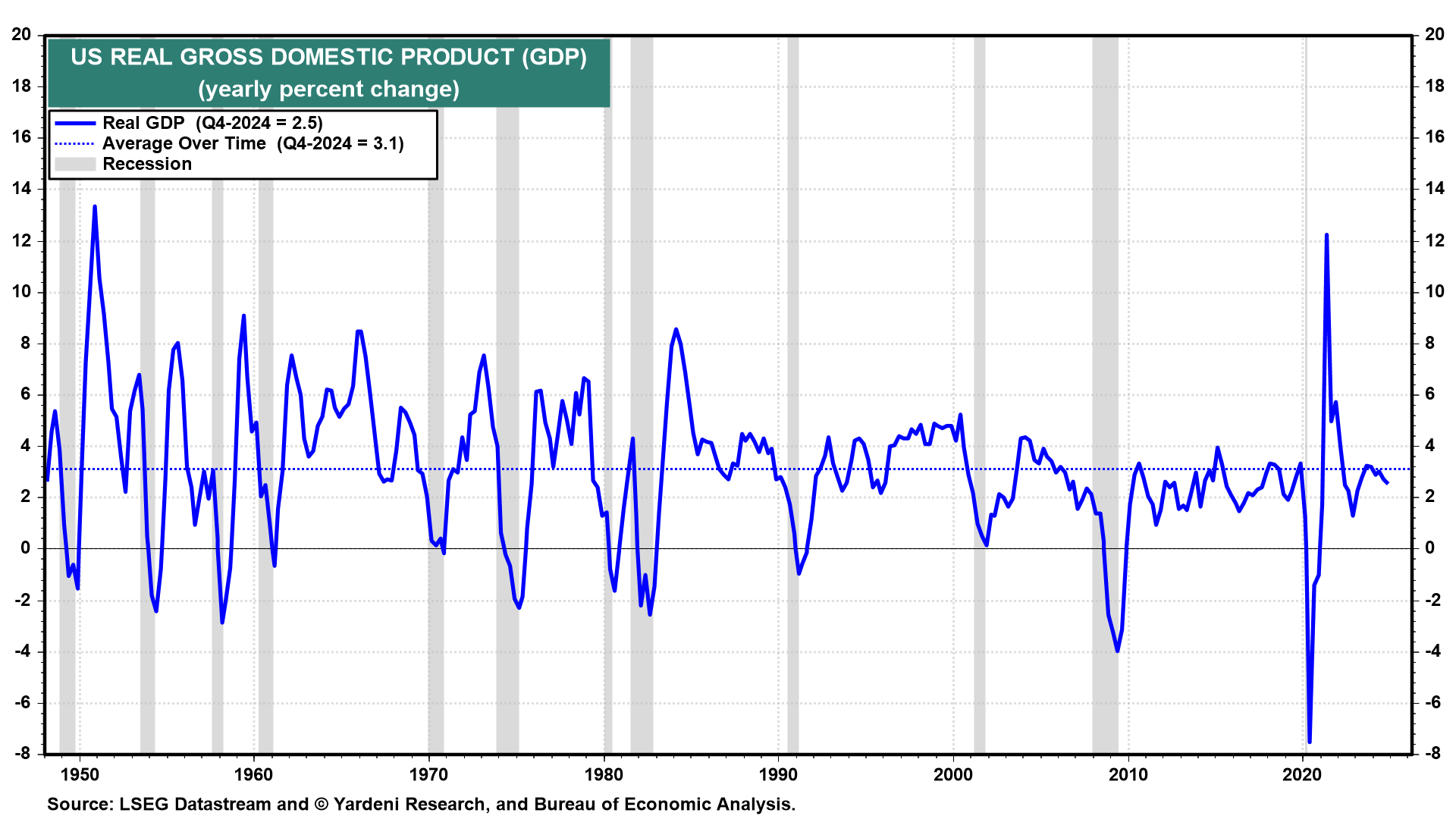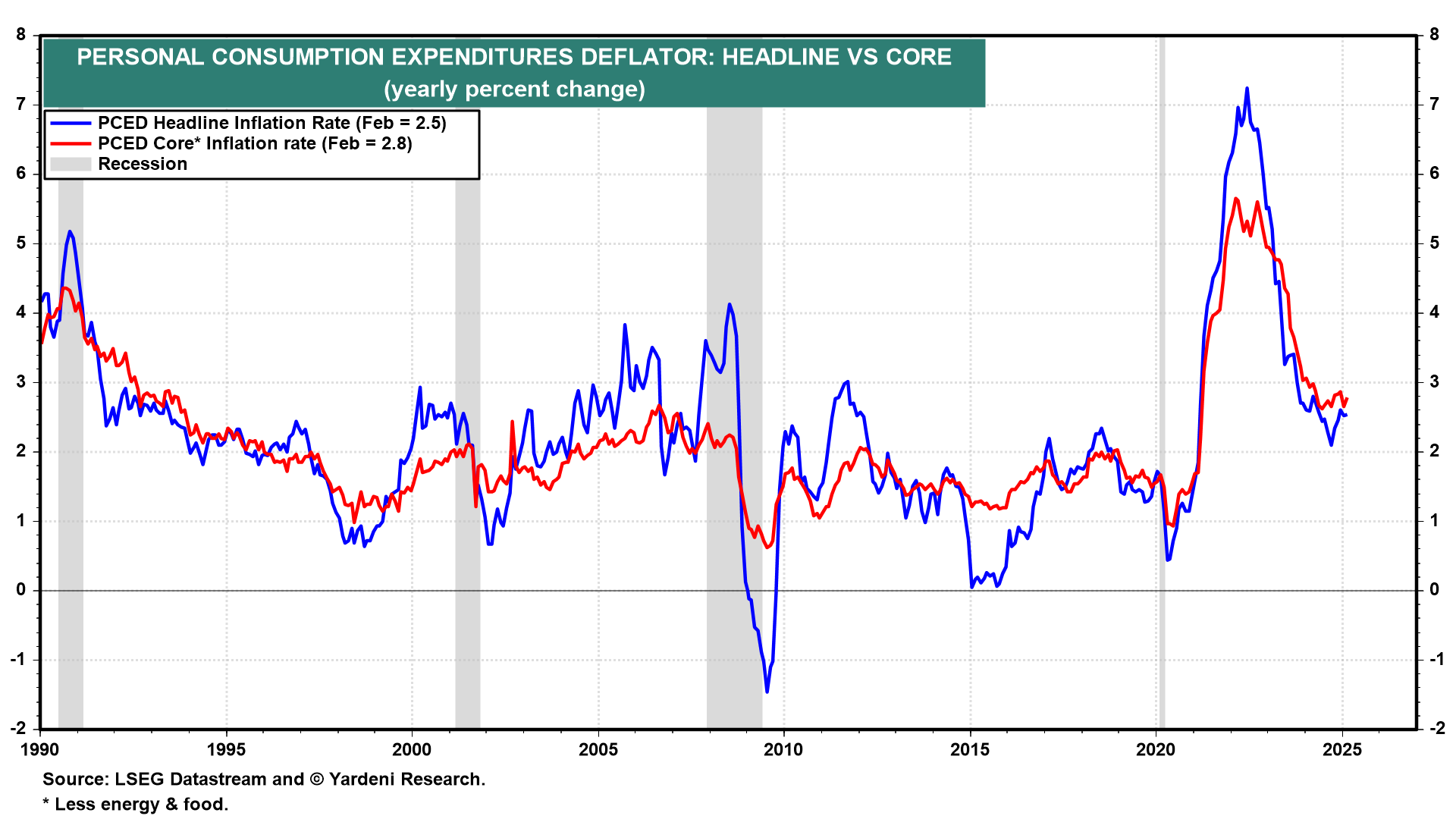 (3) Inflation. As discussed above, we are raising our PCED inflation forecast range to between 3.0%-4.0% over the rest of this year and then lowering it back down to 2.0%-3.0% in 2026. That assumes that there won’t be a trade war with tit-for-tariff retaliation. If there is, there will be a recession that will bring inflation down.