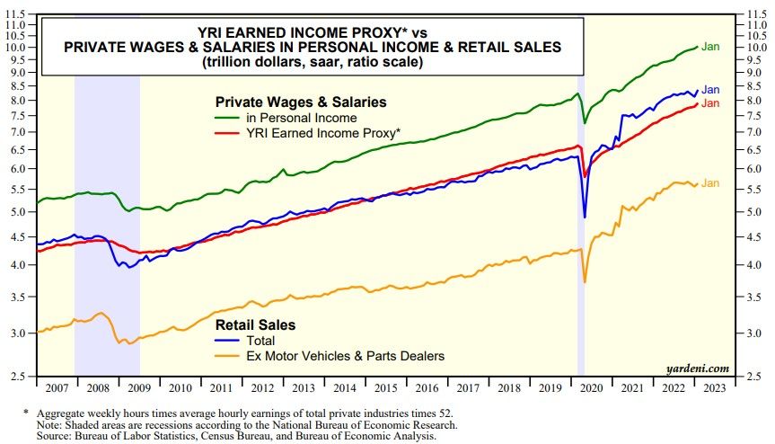 (1) Personal income. We were surprised by January's big payroll employment gain, but not by the strength in the month's retail sales and now personal income. The employment data boosted our Earned Income Proxy for private wages and salaries in personal income (chart). Personal consumption expenditures were boosted by a jump in auto sales and food purchased at restaurants and bars.