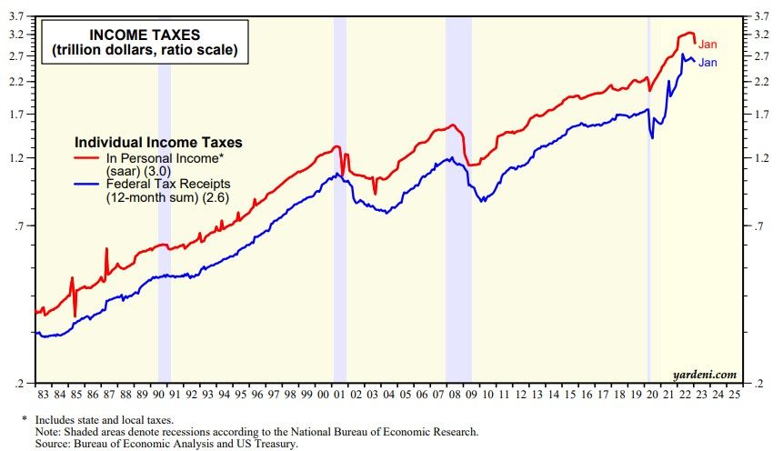 By the way, inflation-adjusted personal income rose 0.6% m/m. while after-tax disposable personal income increased 1.4%. We asked the BEA why the big drop in taxes (chart). It had something to do with the way BEA accounts for taxes not withheld from wages. Income was also boosted by the increase in Social Security payments primarily reflecting an 8.7% cost-of-living adjustment. However, it was offset by reductions in other government social benefits such as the expiration of the extended child tax credit.