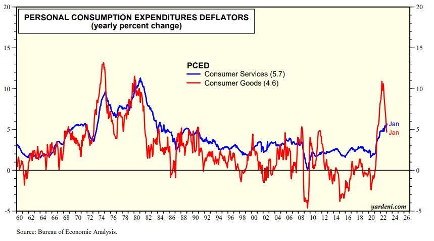 (2) PCED. While January's m/m CPI and PCED inflation rates were hotter than expected, their y/y inflation rates are still disinflating overall (chart). The inflation rate for goods clearly peaked last year. Services has yet to do so, but typically lags. We are expecting it will peak around mid-year.