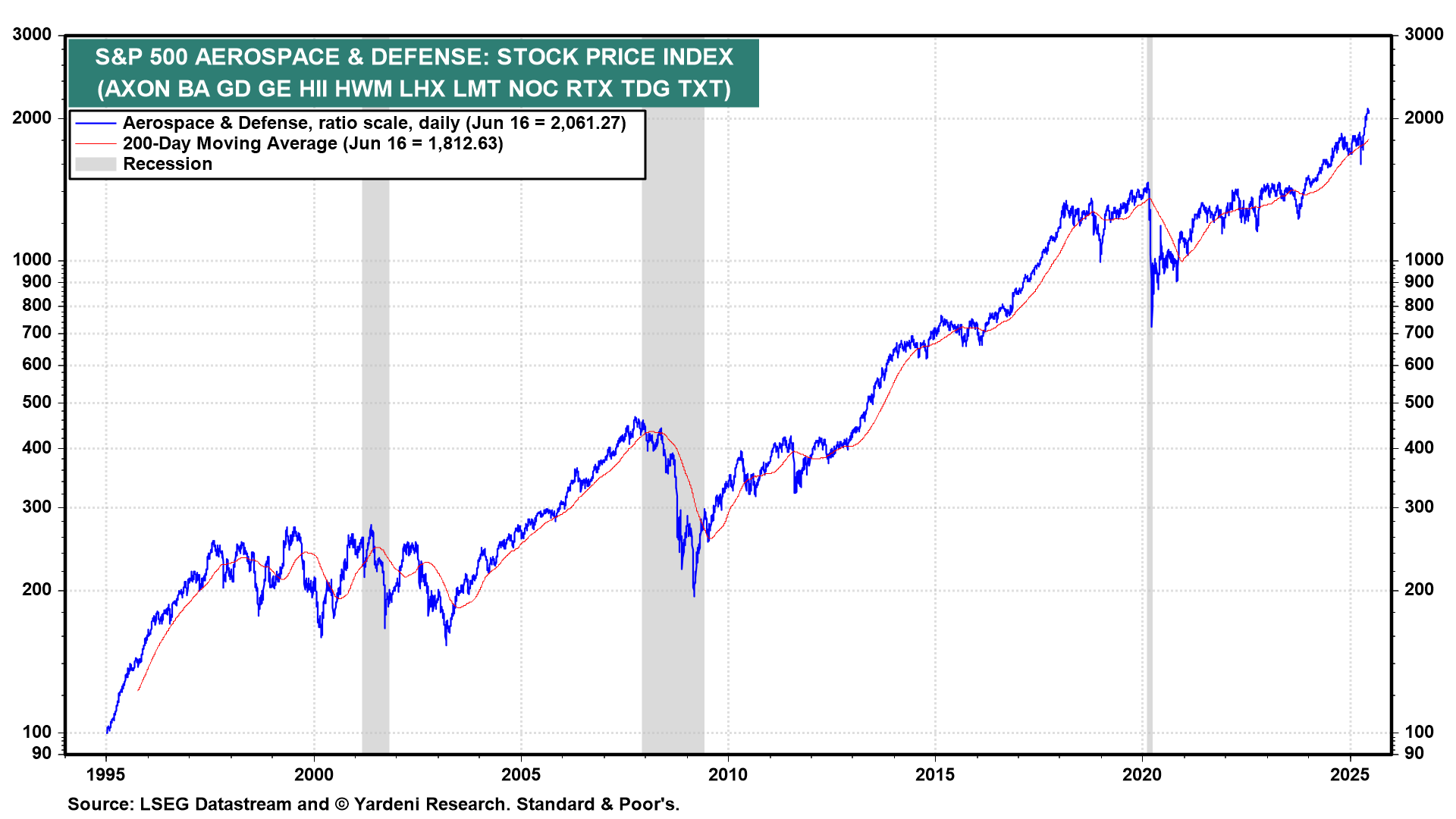 The stock market held up remarkably well today considering that President Donald Trump abruptly left the Group of Seven meeting in the Canadian Rockies this morning. On his way home, he warned Tehran's residents to get out of town immediately. He also warned Iranian leader Ayatollah Ali Khamenei that he is an "easy target" and "our patience is wearing thin." In a subsequent post, he then demanded "UNCONDITIONAL SURRENDER" by Iran. His comments today suggest that the US might enter the war against Iran by dropping bunker-busting bombs on the country's nuclear facilities. The S&P 500 Aerospace & Defense stock price index is soaring in record-high territory (chart).