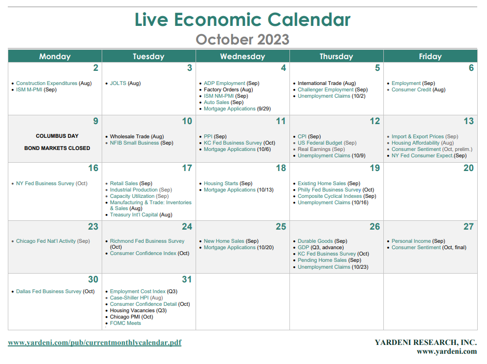 This week should be another disappointing one for the hard-landers. That's been true all year and especially during Q3, when the economic surprises were mostly to the upside as shown by the Citigroup Economic Surprise Index (chart). Q3's real GDP (Thu) is tracking at 5.4% (saar) for the quarter according to the Atlanta Fed's GDPNow.