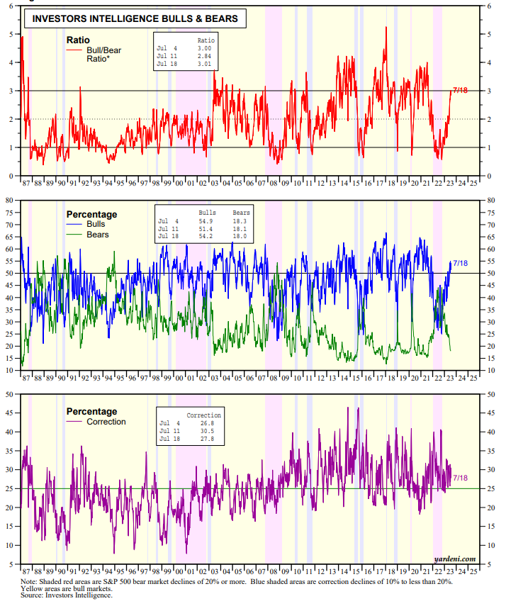 So why is the Investors Intelligence Bull/Bear Ratio (BBR) so high? It was 3.01 during the latest survey week (chart). The percentage of bulls is relatively elevated at 54.2%. That still leaves 18.0% in the bearish camp and 27.8% in the correction camp. Not everybody is bullish. And BBR readings of 3.0 or more don't work as contrary sell signals as well as do readings of 1.0 or less work as buy signals.