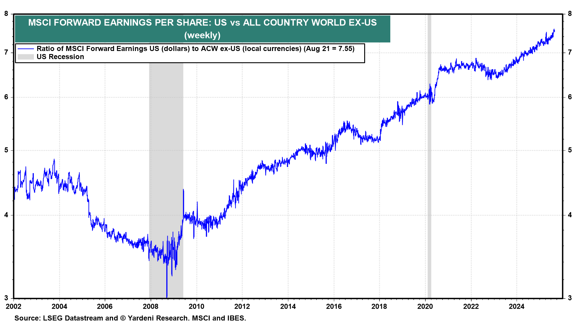 We've often observed that the outperformance of the US in the global stock market derby is fundamentally based on the outperformance of the US MSCI forward earnings compared to the forward earnings of the rest of the world (chart).