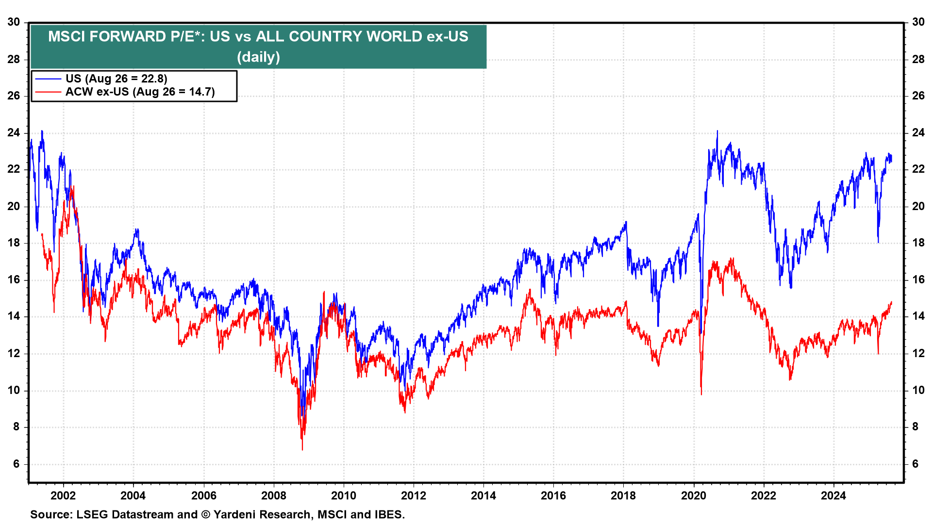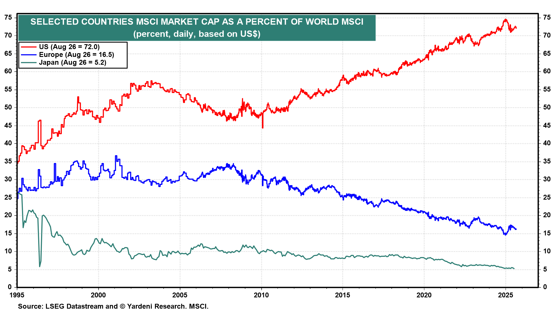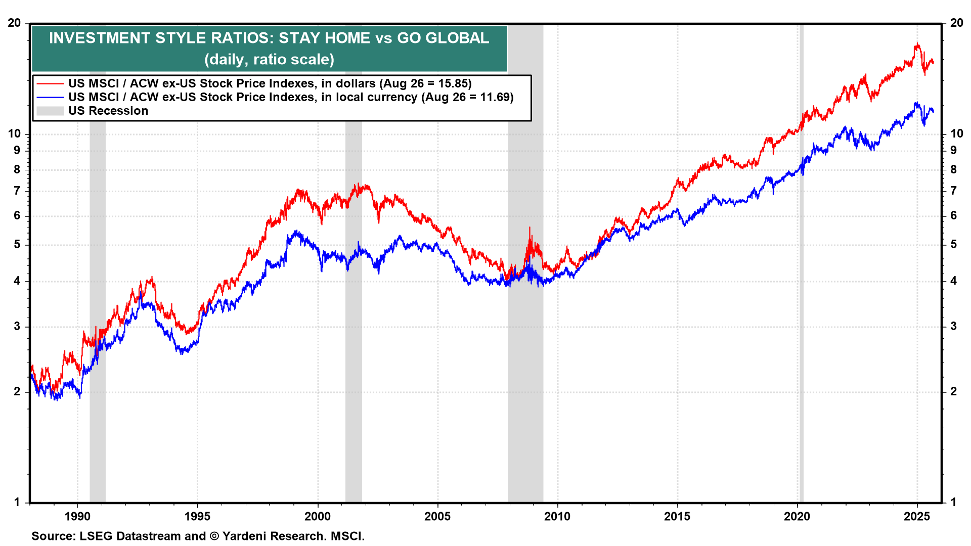 We continue to recommend a Stay Home investment strategy rather than a Go Global one. We've been doing so since 2010, and it has worked out very well. The US now accounts for a whopping 72.0% of the market capitalization of the All Country World MSCI stock price index (chart). That's up from 50.0% in 2010. So, perversely, it is becoming easier to overweight the rest of the world, as it accounts for a relatively small 28.0% share of the world's market capitalization. We don't deny that foreign stocks are cheaper and that there are opportunities to diversify globally.