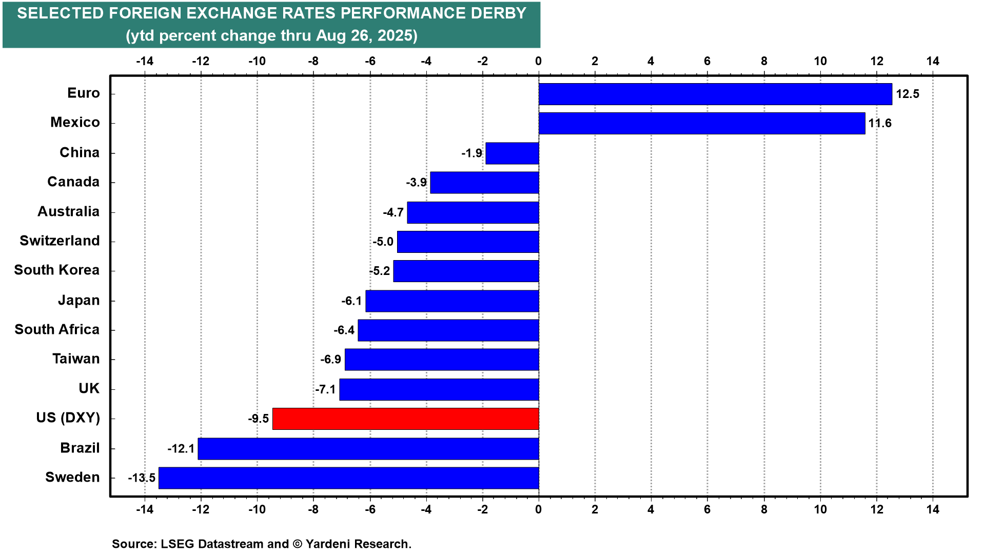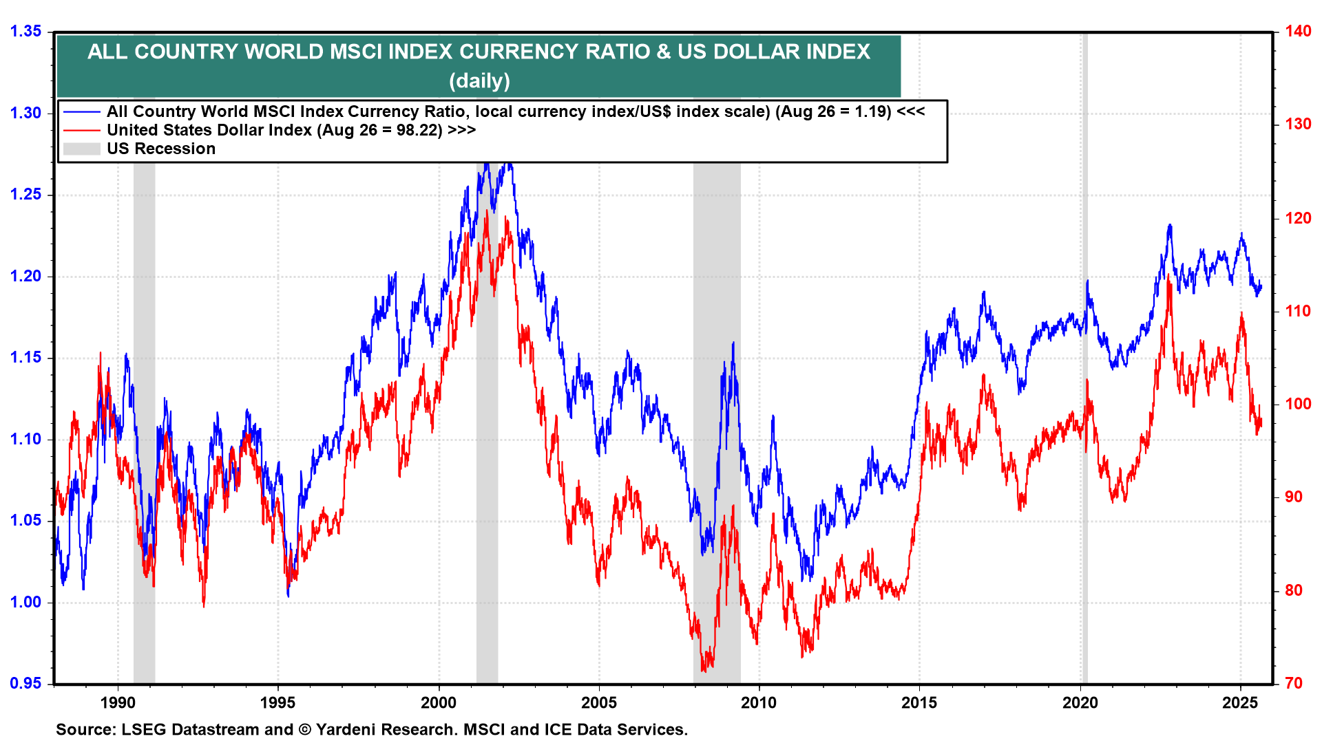 The weaker dollar exacerbated the underperformance of the US earlier this year in dollar terms (chart). We've noted that the DXY dollar index exaggerated the weakness of the dollar this year because it is a fixed-weight index that assigns the euro a 57.6% weight. Also in the DXY are the yen (13.6%), the pound (11.9%), the loonie (9.1%), the krona (4.2%), and the Swiss franc (3.6%). The MSCI currency ratio hasn't been as weak.
