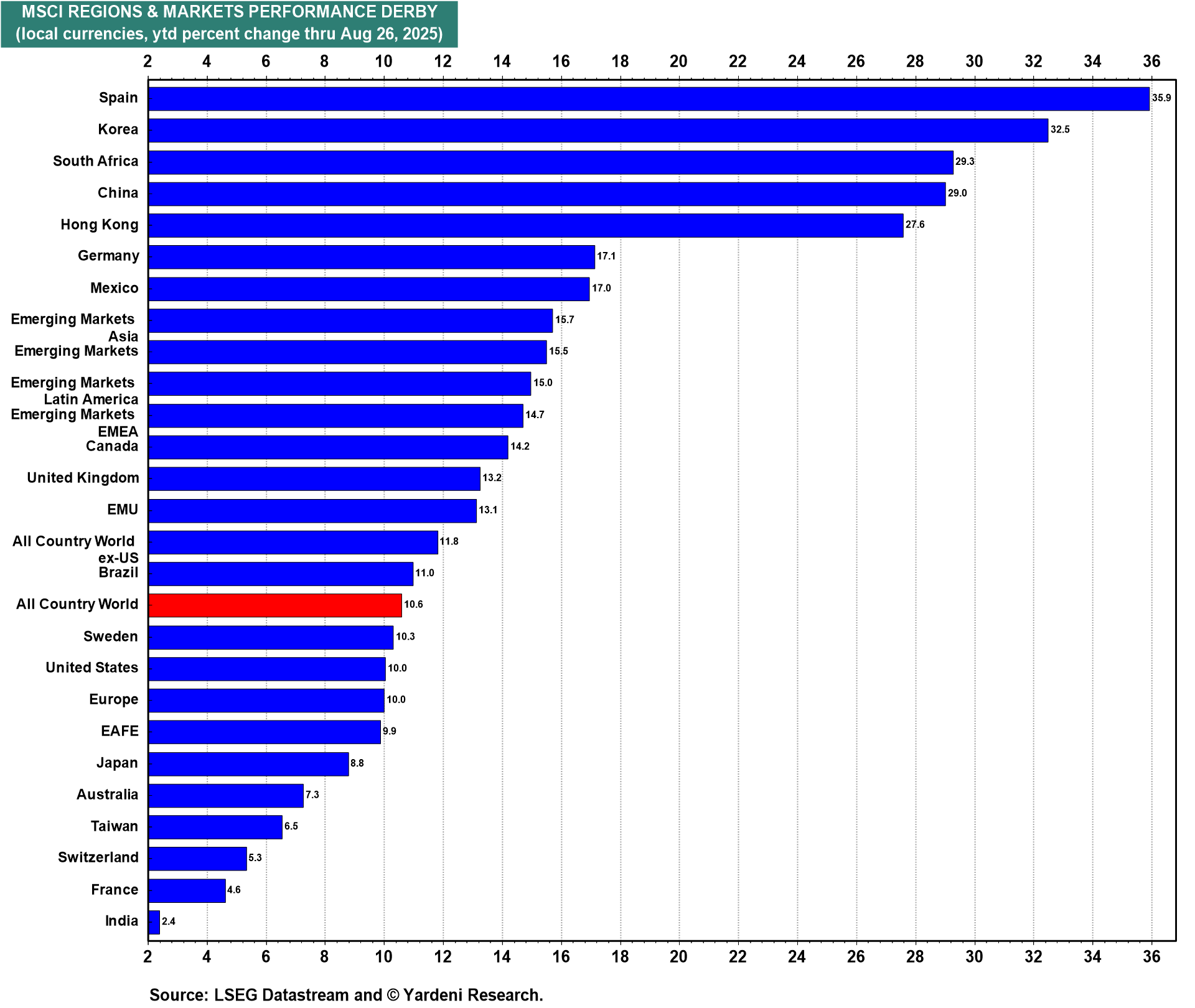 The rest of the world outperformed the US earlier this year, as evidenced by the ytd gains of several countries, including Spain, South Korea, South Africa, China, and Germany. But the US may be catching up again owing to better-than-expected earnings.