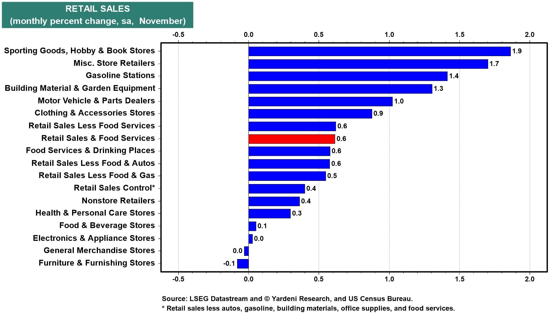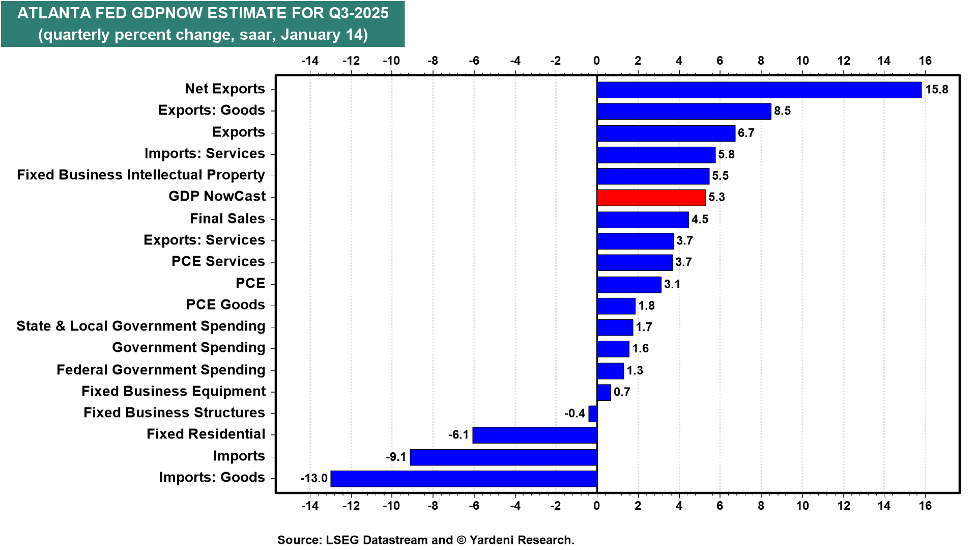 Speaking of “gangbusters,” that adjective describes last year's real GDP performance in Q2 (3.8%), Q3 (4.3%), and probably Q4. The Atlanta Fed's GDPNow estimated growth rate for the final quarter of 2025 was raised from 5.1% yesterday to 5.3% today after the release of November's solid retail sales report (charts).