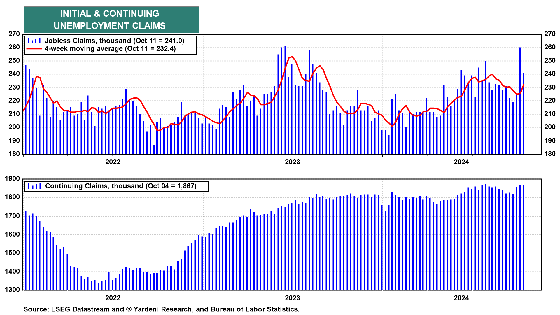 (2) Unemployment claims. The good news on consumer spending was paired with good labor market news. Initial jobless claims fell 17,000 in the week ended October 12 to 241,000 (sa) (chart). The impact of hurricanes and manufacturing layoffs amid strikes were expected to spur more jobless claims. Indeed, the largest increases on a state-by-state basis were in rust-belt states and those hit by Hurricane Helene (i.e., Michigan, North Caroline, Ohio, and Florida). Today's report shows that the jobs market broadly remains on solid footing.