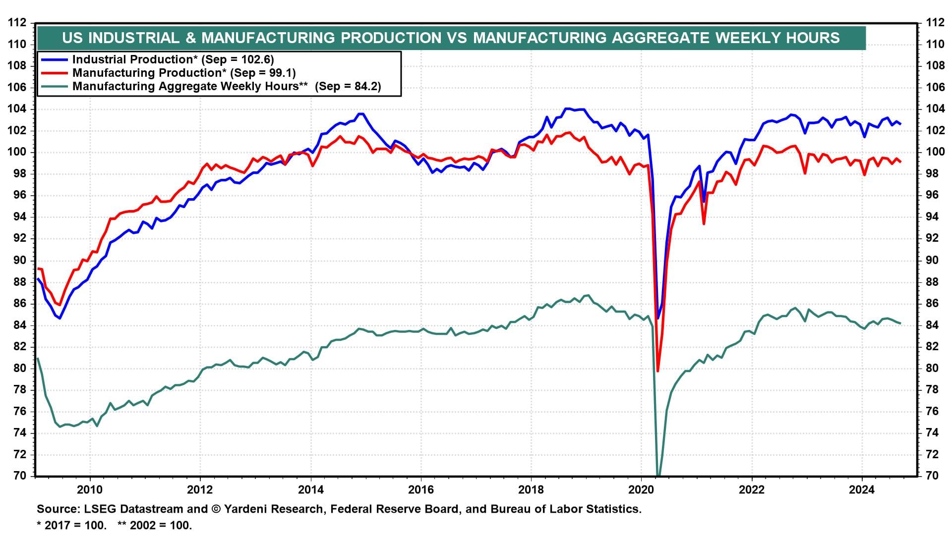 (3) Industrial production. September's industrial production (IP) fell 0.3% after rising 0.3% the prior month. We expected IP to edge lower after manufacturing weekly hours dipped 0.1% in September (chart). The Federal Reserve estimated that the Boeing strike reduced IP growth by 0.3% in September, while Hurricanes Helene and Milton subtracted an additional 0.3%. In other words, IP held up relatively well last month.