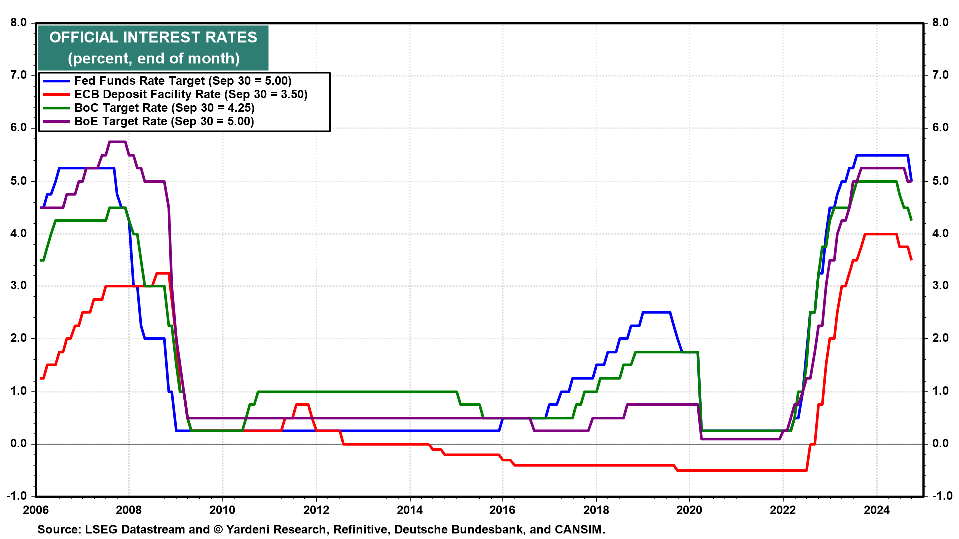 (4) ECB. The European Central Bank (ECB) cut rates for the third time this year today, lowering the Eurozone's benchmark rate by 25bps to 3.25% (chart). The move was widely expected as headline inflation in the Eurozone is below 2.0% while growth is flagging. We expect economic growth to remain stronger in the US than the Eurozone. There is also a higher likelihood that inflation gets stuck above 2.0% in the US. In that scenario, the euro is likely to fall as the ECB cuts rates more than the Fed.