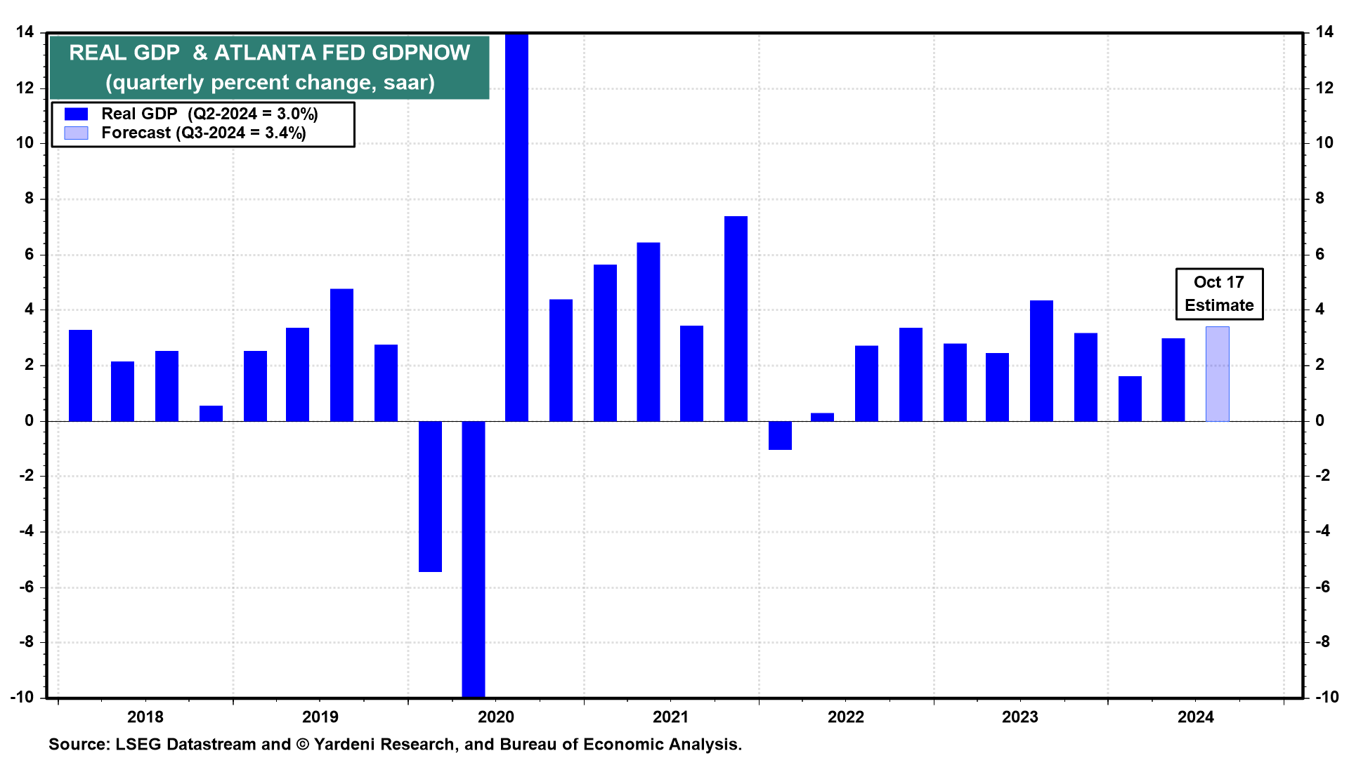 Today, the Atlanta Fed's GDPNow tracking model raised Q3's real GDP growth rate from 3.2% to 3.4% (saar) following a roaring September retail sales report (chart). Real consumer spending was revised up from 3.3% to 3.6%! Jobless claims fell despite worker strikes and hurricanes. Manufacturing also held up well notwithstanding Boeing layoffs and bad weather.