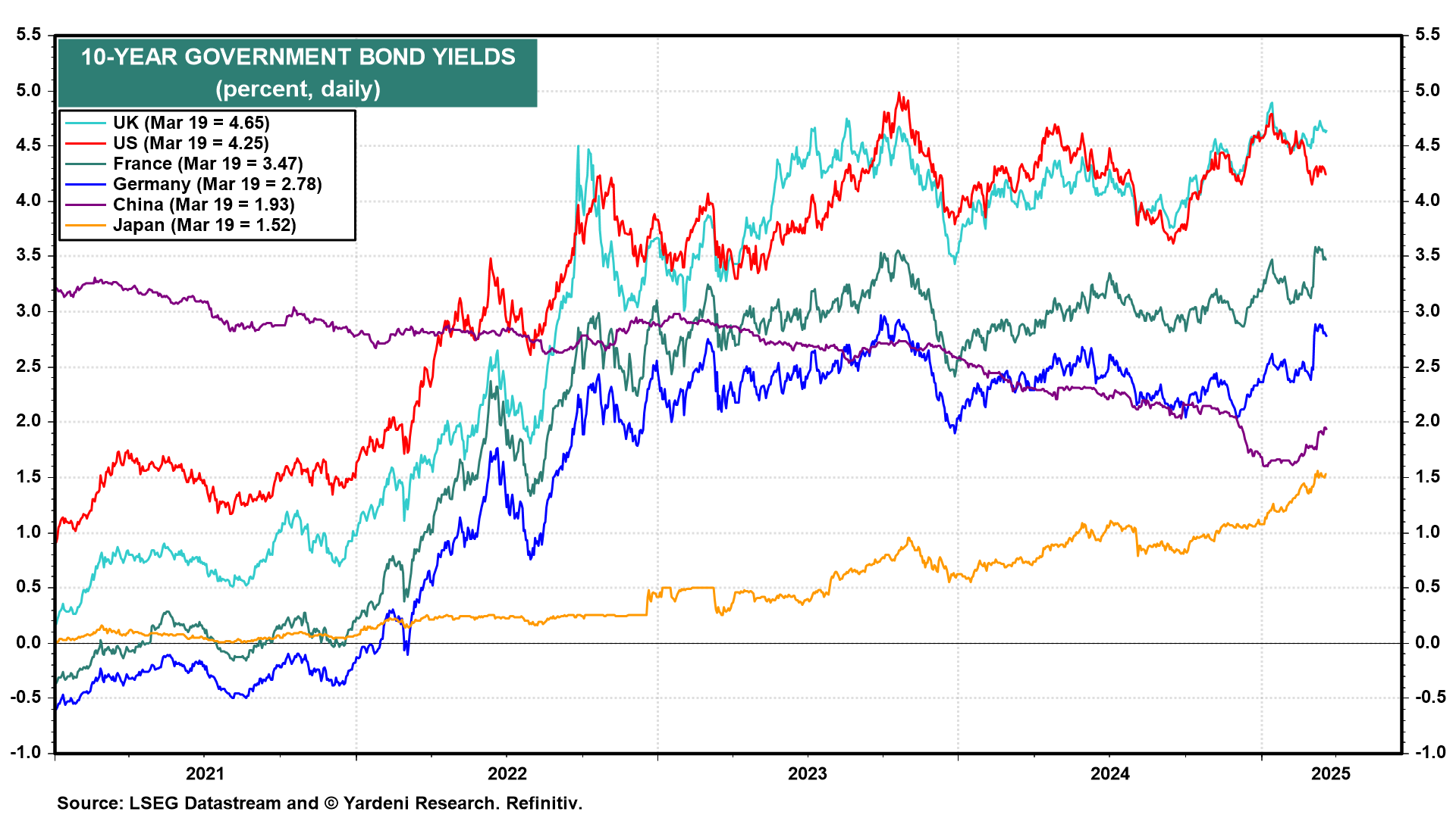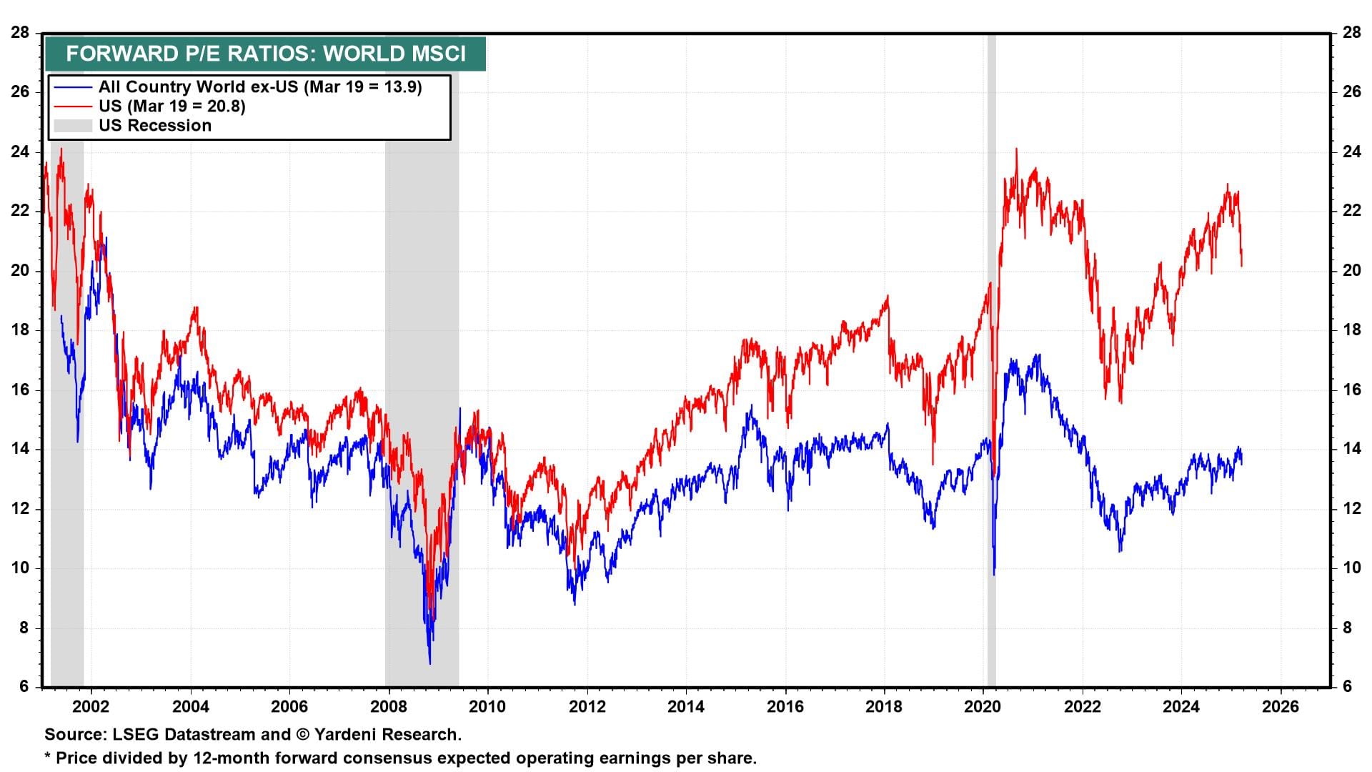 Today's batch of economic data releases was positive on balance but also suggests that Trump Tariff Turmoil 2.0 could dampen future growth. Stock prices seesawed between gains and losses, while Treasury yields slid a bit. Markets continue to suggest that economic growth outside of the US is increasingly likely to improve while downside risks to US growth are rising. As a result, US stock valuation multiples are falling closer to their international counterparts (charts).