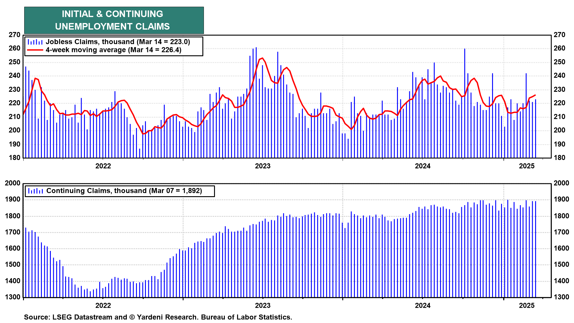 (2) Jobless claims. The labor market remains strong, underpinning our belief in the US consumer. Initial jobless claims totaled just 223,000 for the week ended March 15, up 3,000 from the prior week and historically low (chart). Continuing claims rose 22,000 but have plateaued just below 1.9 million for the past several quarters.